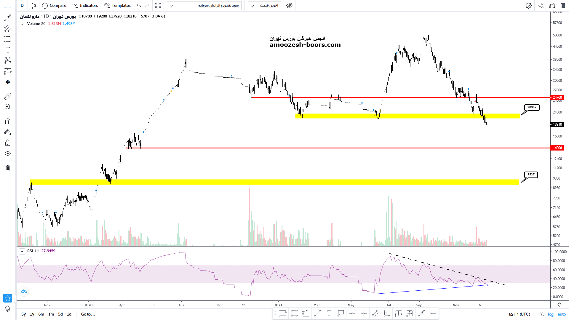 قیمت سهم دلقما پس از شکست حمایت محدوه 2000 تومان در حال حرکت به سمت محدوده حمایتی 1400 میباشد و با توجه به واگرایی اندیکاتور قیمت در صورت واکنش مثبت به محدوده 1400 تومان سیگنال ورود صادر و میتواند تا مقاومت 2000 تومان صعود کند و در صورت عدم حمایت و شکست محدوده حمایتی 1400 انتظار اصلاح بیشتر تا محدوده 1000 تومان نیز از سهم دلقما میرود