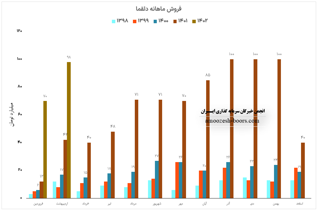 درآمد 70 میلیارد تومانی نماد دلقما در فروردین ماه سال 1402 گزارش مطلوبی میباشد چرا که نسبت به ماه قبل 77% و نسبت به مدت مشابه 483% افزایش داشته است، انواع ویال پر فروش ترین محصول شرکت داروئی و بهداشتی لقمان میباشد که با وجود کاهش نرخ 14 درصدی با افزایش 228 درصدی در مقدار فروش همراه بوده است.