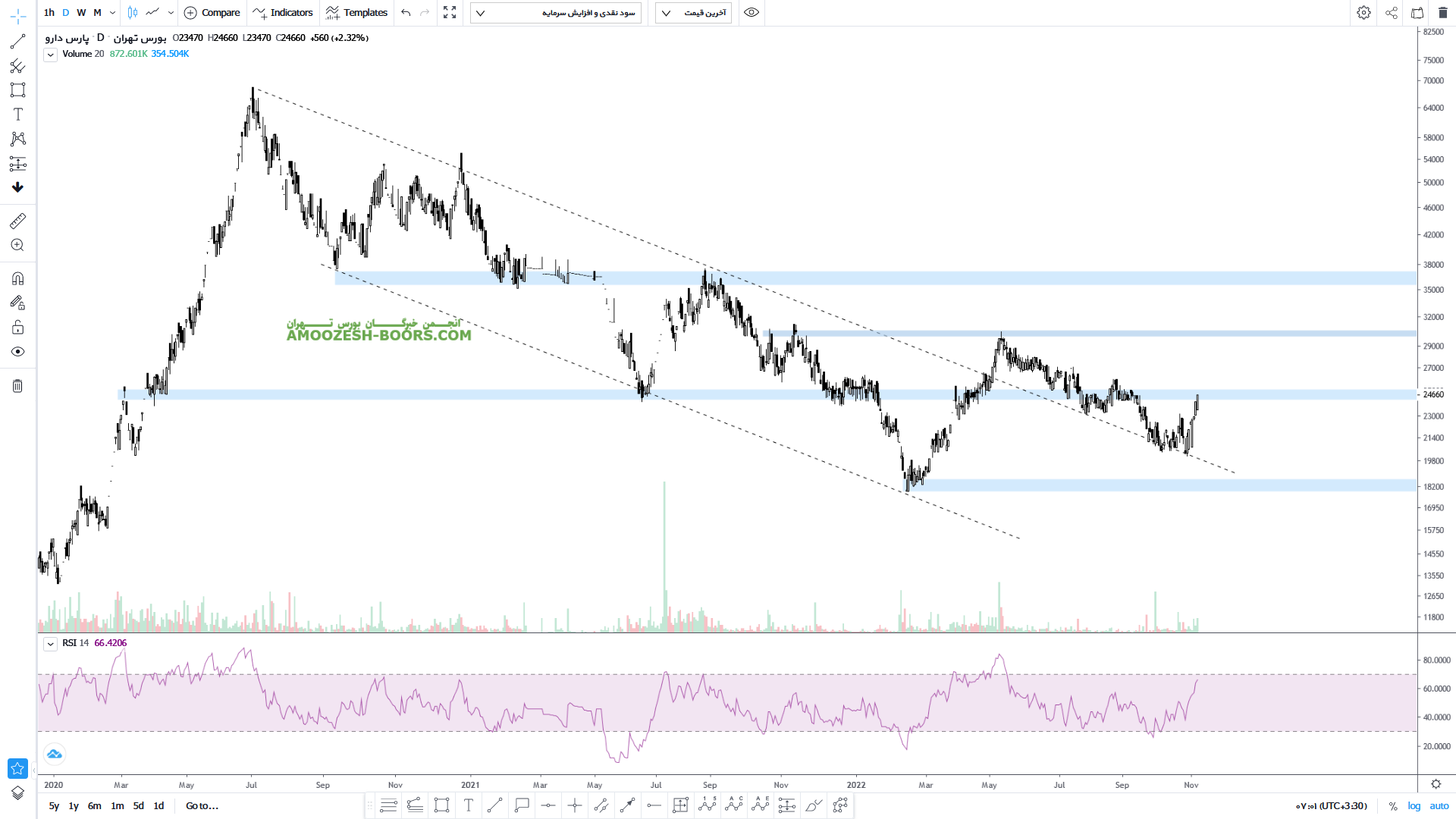 قیمت سهم دپارس پس از خروج از سقف کانال نزولی و برخورد به ناحیه مقاومتی 3000 تومان وارد اصلاح شده و پس از یک اصلاح فرسایشی با برخورد به یک ناحیه حمایتی رشدی را تا ناحیه مقاومتی ۲۵۰۰ تومان تجربه کرده است اکنون میتواند با شکست این ناحیه مقاومتی سیگنال ورود صادر و رشد خود را تا ناحیه 3000 تومان نیز ادامه دهد اما در صورت برگشت مجدد میتواند کف مهم ۱۸۰۰ تومان را تست کند.