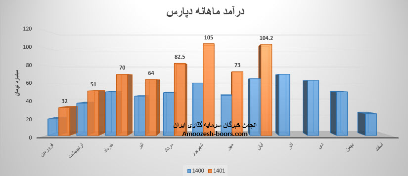 سهم دپارس در مهر ماه سال 1401 حدود مبلغ 73 میلیارد تومان درآمد داشته که این میزان در مقایسه با ماه گذشته 30% کاهش و همچنین در مقایسه با مدت مشابه سال گذشته 59% افزایش درامد پیدا کرده است.
