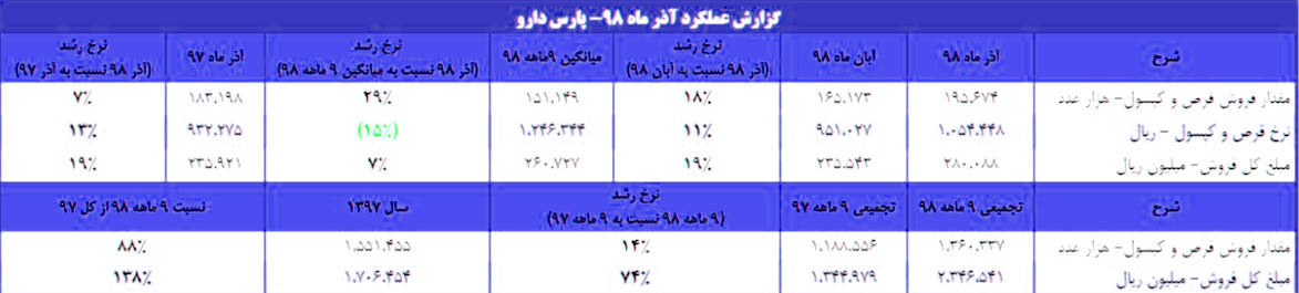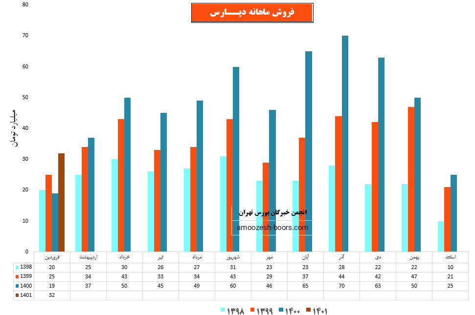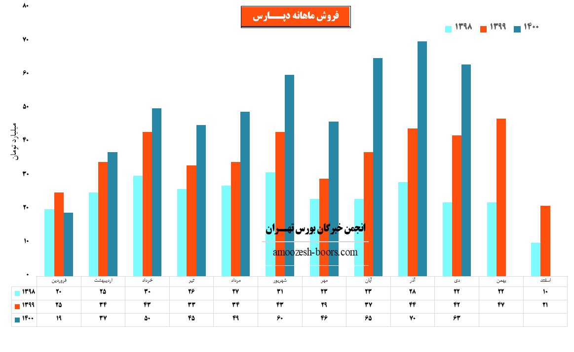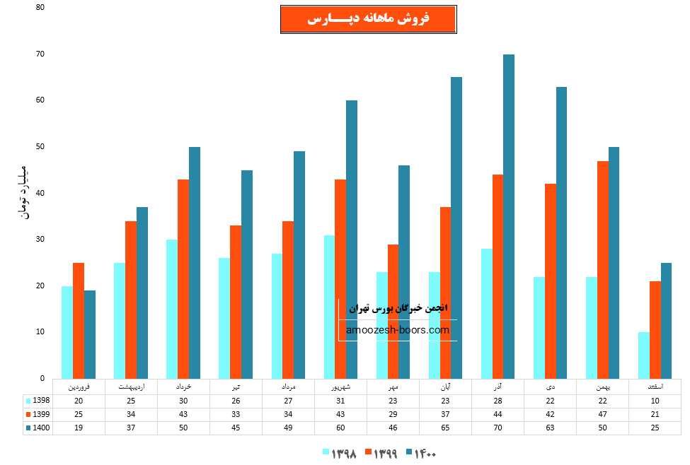 سهم دپارس در دی ماه حدود 72 میلیارد تومان درامد داشته که در مقایسه با درامد ماه گذشته با 10درصد افت و همچنین در مقایسه با مدت مشابه سال گذشته با 50 درصد رشد روبروشده است. میلیارد تومان فروش داخلی داشته که با توجه به کسر مبلغ 9 میلیارد تومان بابت برگشت های فروش و تخفیف ها خالص فروش ماه دپارس مبلغ 63 میلیارد می شود
