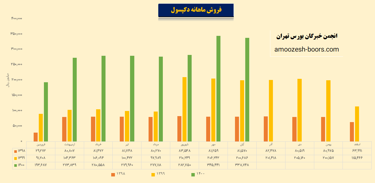 این افزایش منظم نرخ فروش ِسهم دکپسول طبیعتا تاثیر مثبتی در فروش کل این نماد نیز گذاشته است به این صورت که در سه سال گذشته بطور میانگین هر سال فروش کل خود را دو برابر کرده است! سال 98، 90 میلیارد فروش کل سال 99، 184 میلیارد فروش کل و سال 1400 تا به اینجای کار 273 میلیارد فروش کل داشته است!