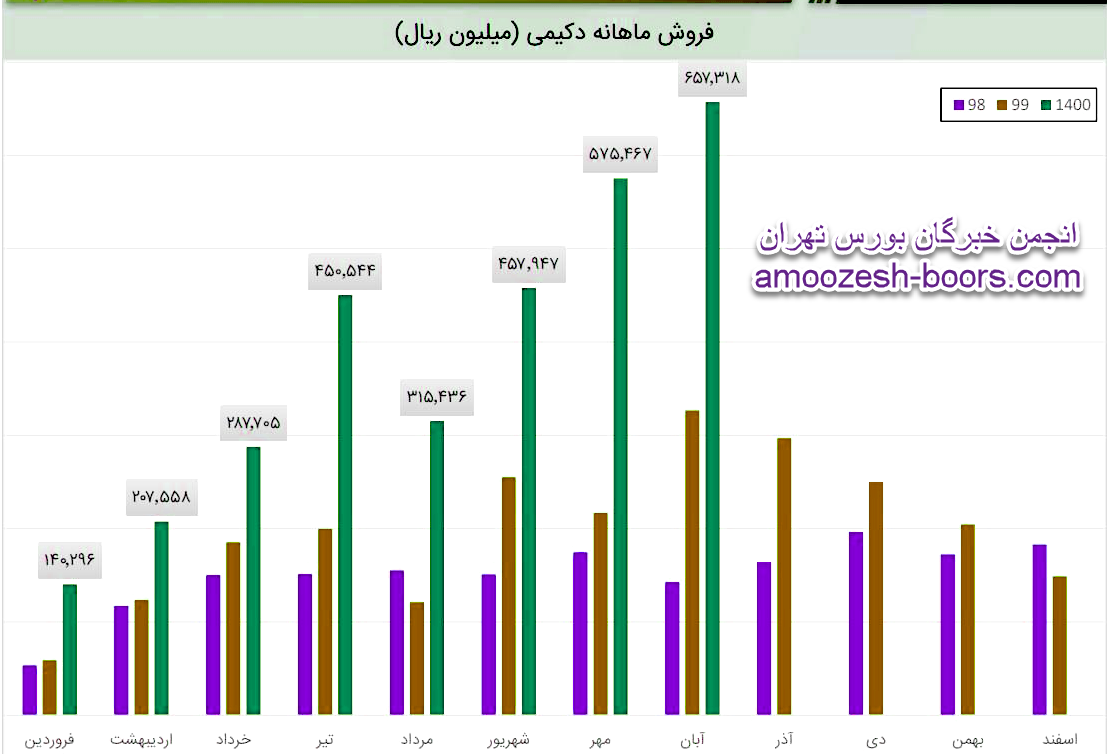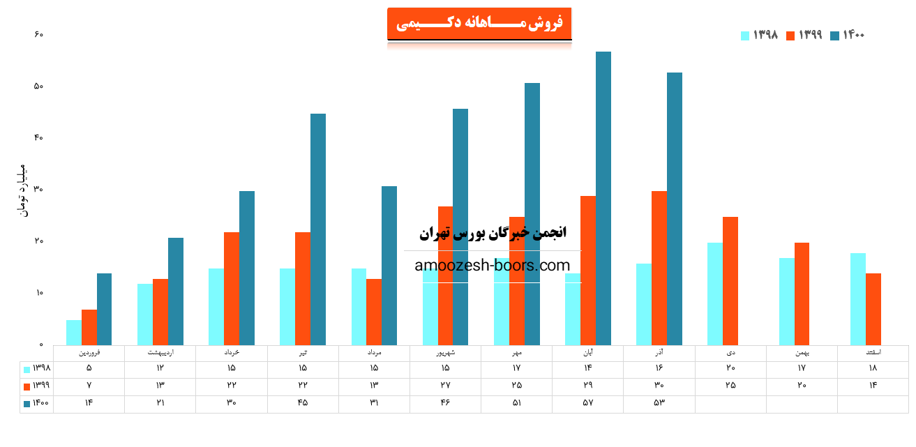 سهم دکیمی طی عملکرد 1 ماهه منتهی به 1400/05/31 معادل 315,436 میلیون ریال از محصولات خود را به فروش رسانده که نسبت به دوره 1 ماهه مشابه سال قبل 160% افزایش داشته است.