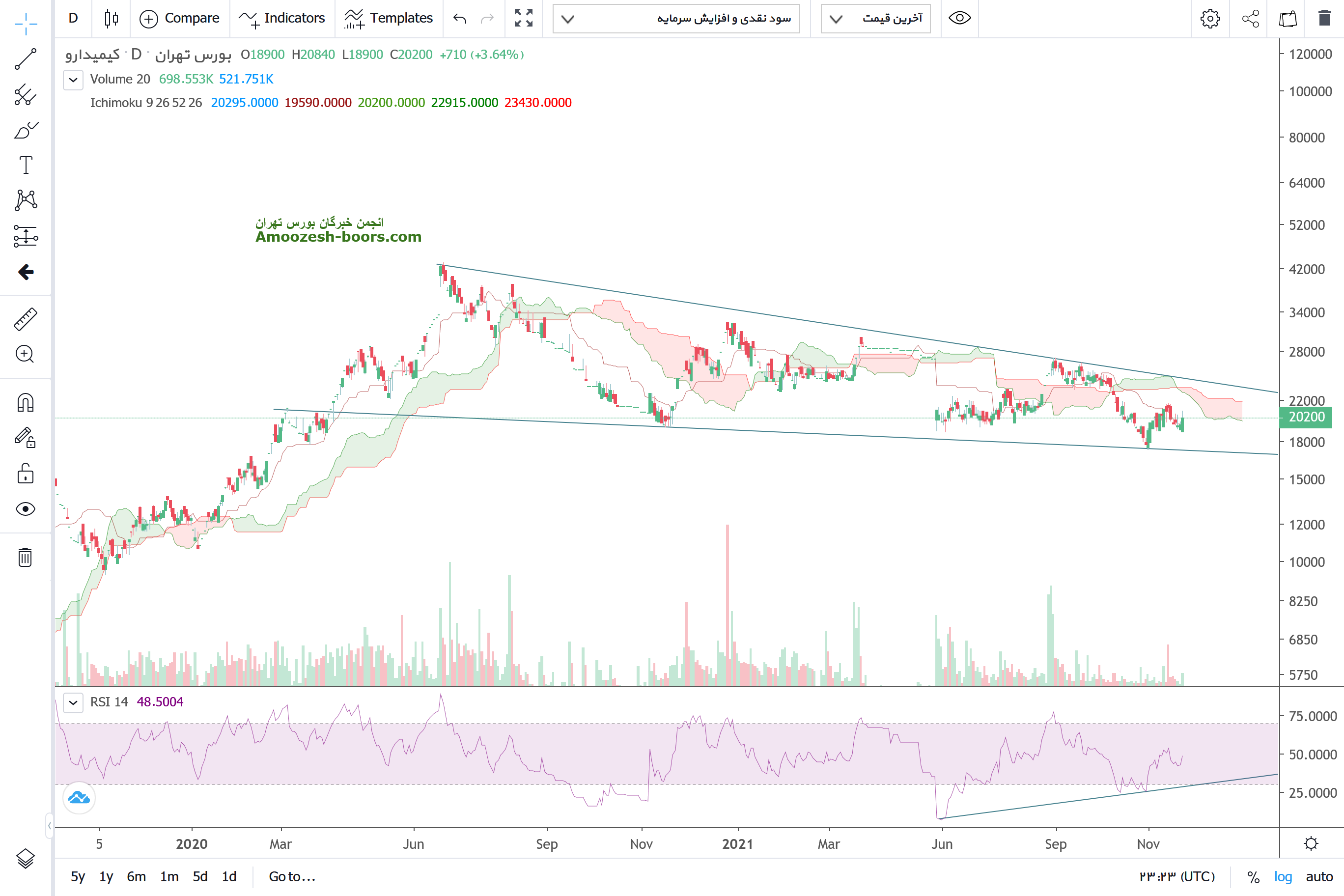 قیمت سهم دکیمی پس از ایجاد واگرایی مثبت در کف الگوی وج تثبیت شده و در حال حاضر درگیر مقاومت روانی عدد رند ، مووینگ ماهانه و سطح استاتیک 20000 میباشد تارگت 23000 سقف مقاومت داینامیک نزولی و حمایت سهم دکیمی 17000 در نظر گرفته خواهد شد .