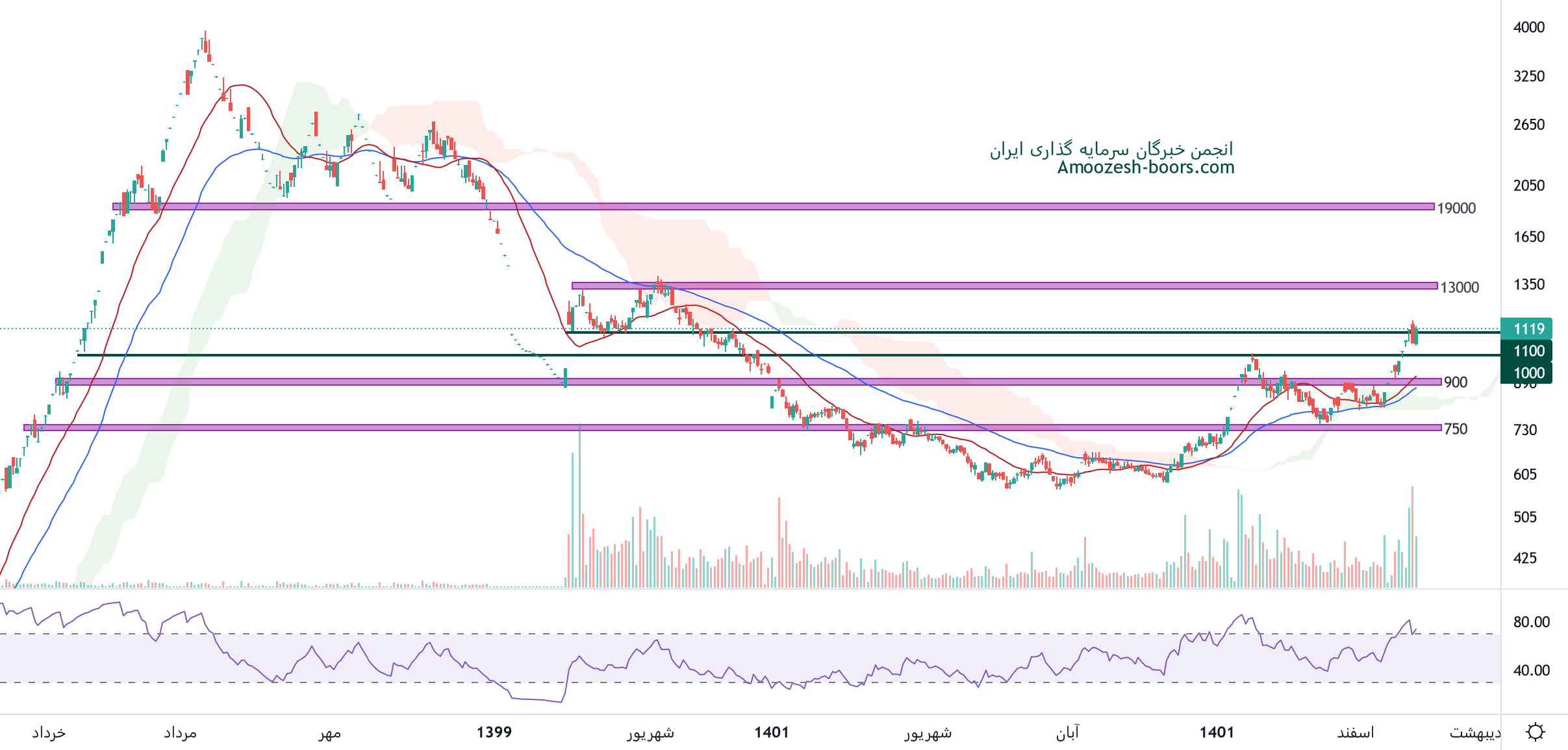 نماد دی درگیر سطح مقاومتی 1100 ریال میباشد، در صورت ادامه دار شدن فشار تقاضا و عبور از این سطح مقاومتی، مقاومت بعدی 13000 در نظر گرفته خواهد شد، همچنین در صورت ورود سهم دی به فاز اصلاحی، حمایت های سهم 1000 و 900 ریال محسوب میگردد، توصیه میشود مادامی که قیمت موفق به شکست این سطح مقاومتی نشده اقدام به خرید نشود.