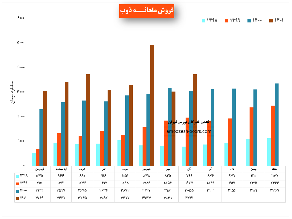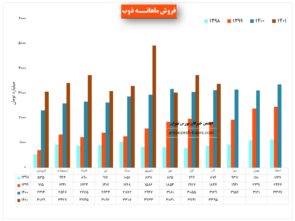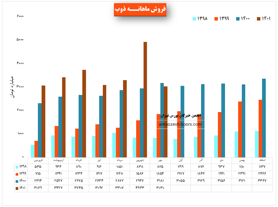 نماد ذوب (شرکت ذوب آهن اصفهان) در آبان ماه ۱۴۰1 حدود مبلغ 3741 میلیارد تومان درآمد داشته که این میزان در مقایسه با ماه گذشته 23% و همچنین در مقایسه با مدت مشابه سال گذشته 22% افزایش پیدا کرده است.