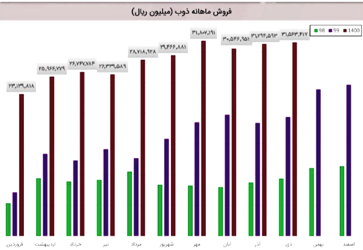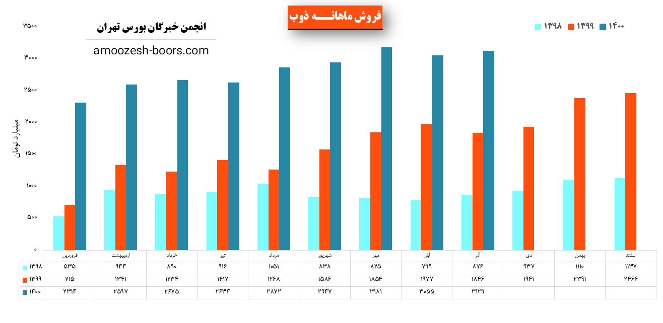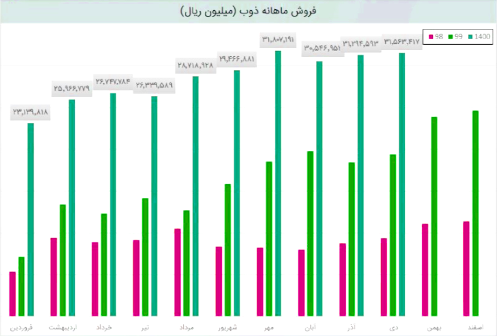 ذوب در آذر 1400 مبلغ 3129 میلیارد تومان درامد داشته که این میزان نسبت به ماه گذشته 2% و همچنین نسبت به مدت مشابه سال گذشته 70% رشد پیدا کرده است!
