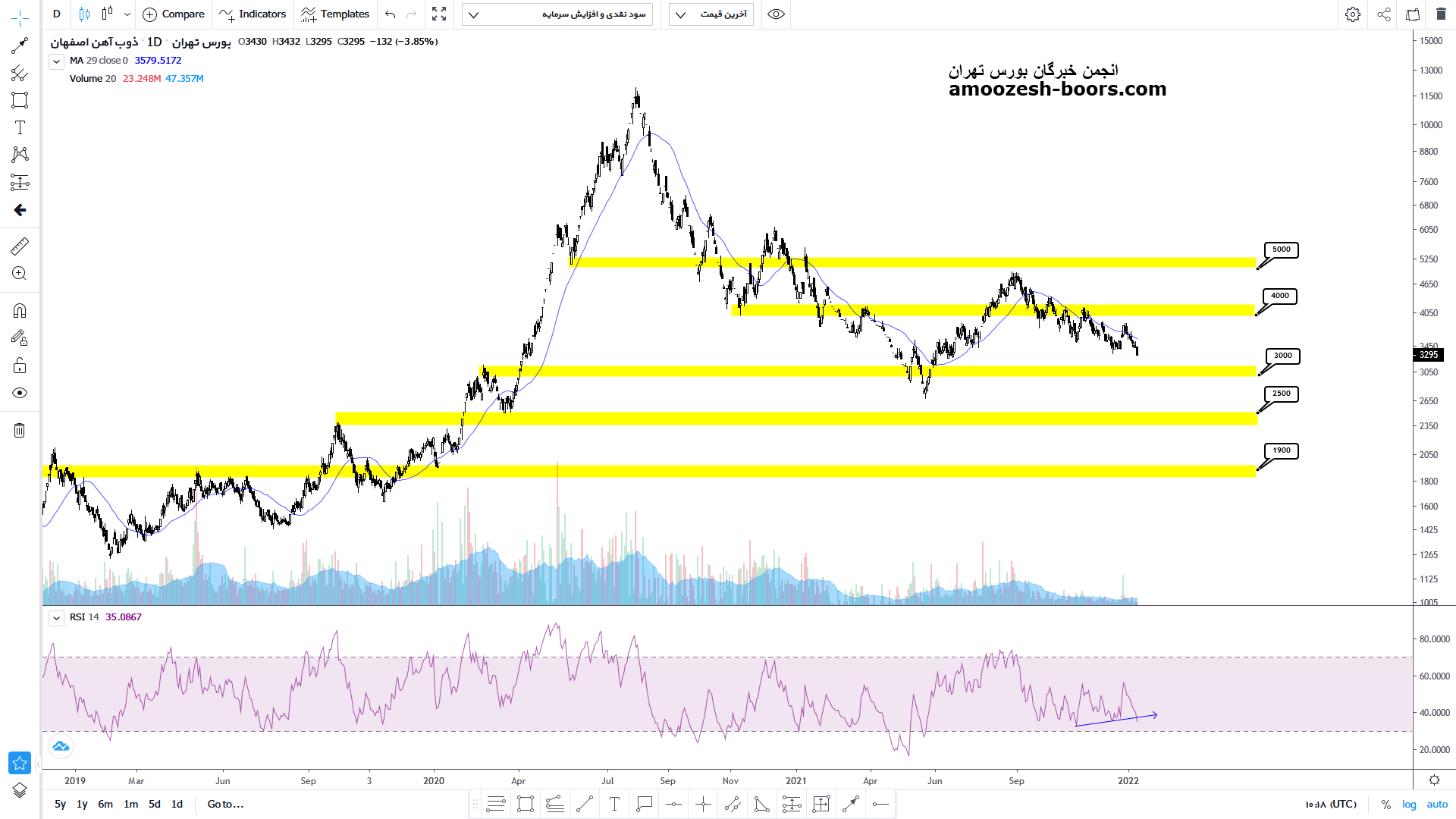 با توجه به قرار گیری قیمت بر روی محدوده پر تراکم حمایتی 250 الی 300 تومان، انتظار رشد از این محدوده حمایتی از سهم میرود.