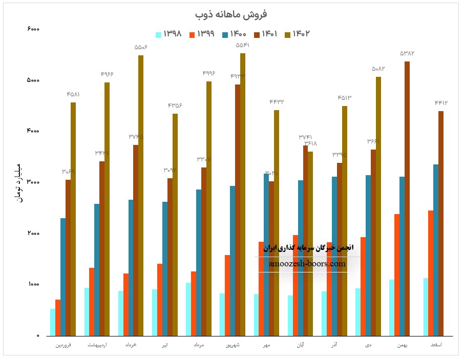 نماد ذوب (شرکت ذوب آهن اصفهان) در دی ماه سال 1402 حدود مبلغ 5082 میلیارد تومان درآمد داشته که این میزان در مقایسه با ماه گذشته 13 درصد و همچنین در مقایسه با مدت مشابه سال گذشته 39 درصد افزایش پیدا کرده است.