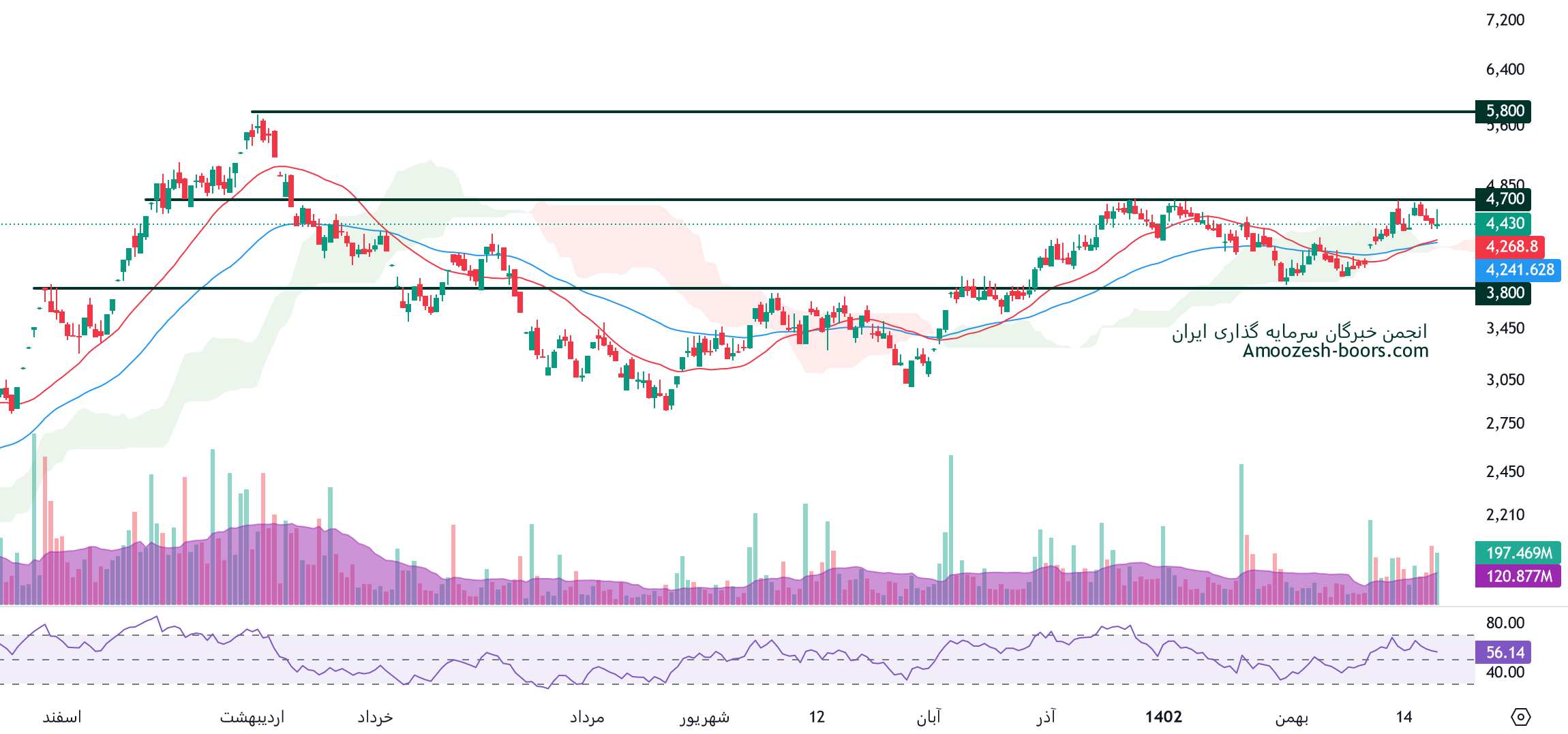 مقاومت نماد ذوب از ناحیه پر تراکم 4700 ریال تشکیل شده است و با توجه به شرایط بازار شکست مقاومت و رسیدن به تارگت 5800 ریال خوش بینانه میباشد.