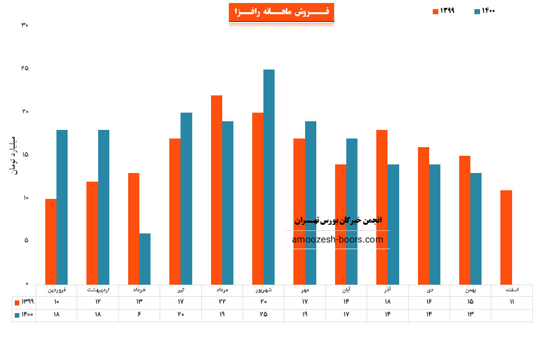 شرکت رایان هم افزا با نماد رافزا در بهمن ماه ۱۴۰۰ حدود مبلغ ۱۳ میلیارد تومان درآمد داشته که این میزان در مقایسه با ماه گذشته ۷ % و همچنین در مقایسه با مدت مشابه سال گذشته ۱۳ % افت درآمد داشته است.