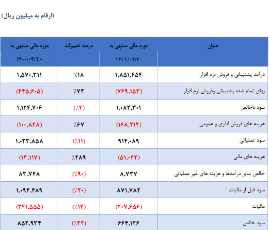 درآمدهای شرکت شامل: فروش نرم افزار و پشتیبانی، درآمدزایی از واحدهای کارگذاری (بهای خدمات پشتیبانی نرم افزار)، درآمدزایی از واحد های سبد گردانی(سامانه مدیریت سبدگردانی)، سامانه مدیریت صندوقهای سرمایه گذاری مشترک و ..... می باشد.