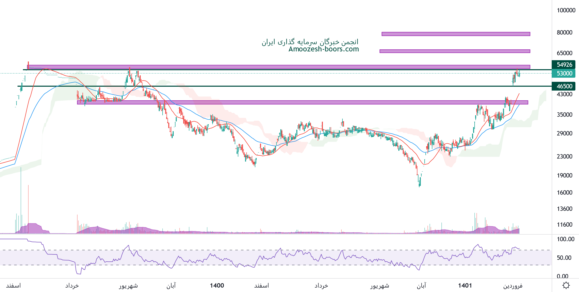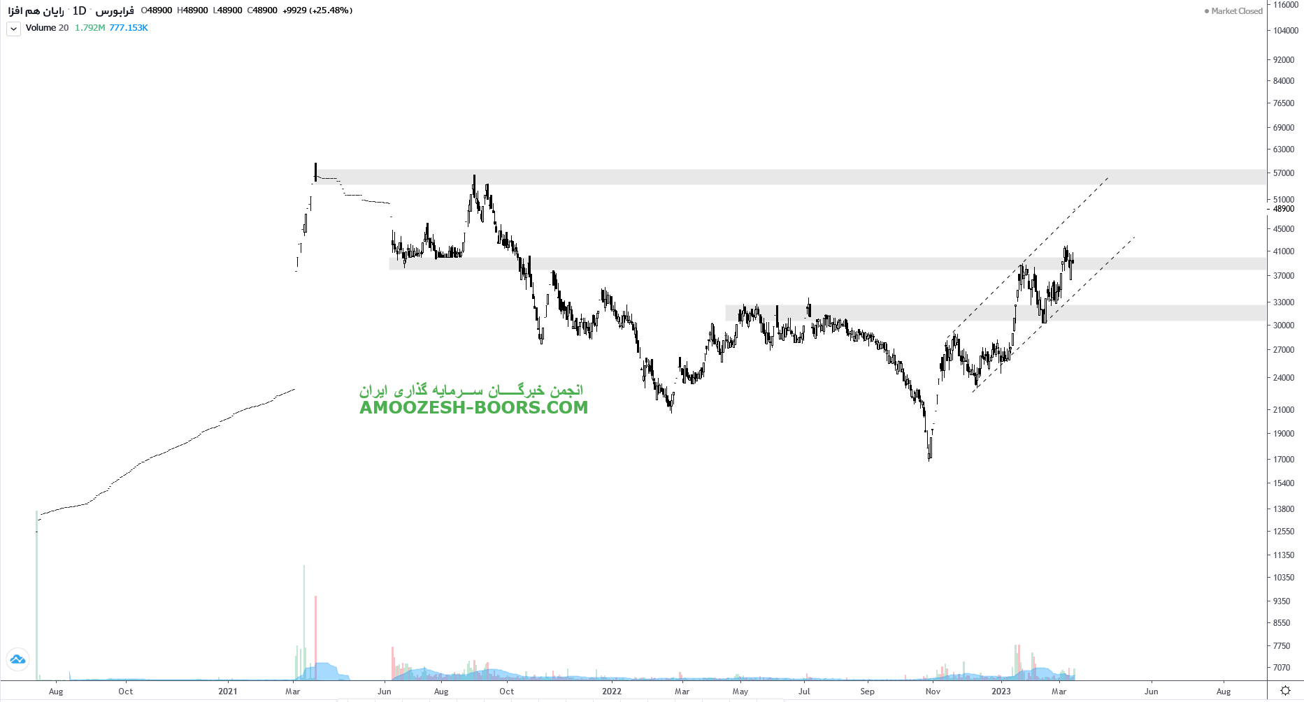 نماد رافزا محدوده مقاومتی 55000 ریال را پیش رو دارد، با توجه به پارامتر های صعودی بازار عبور از این مقاومت محتمل خواهد بود و حرکت سهم تا محدوده 65000 ریال محتمل خواهد بود، همچنین در صورت ورود سهم رافزا به فاز اصلاحی، اولین حمایت سهم 46500 ریال در نظر گرفته خواهد شد.