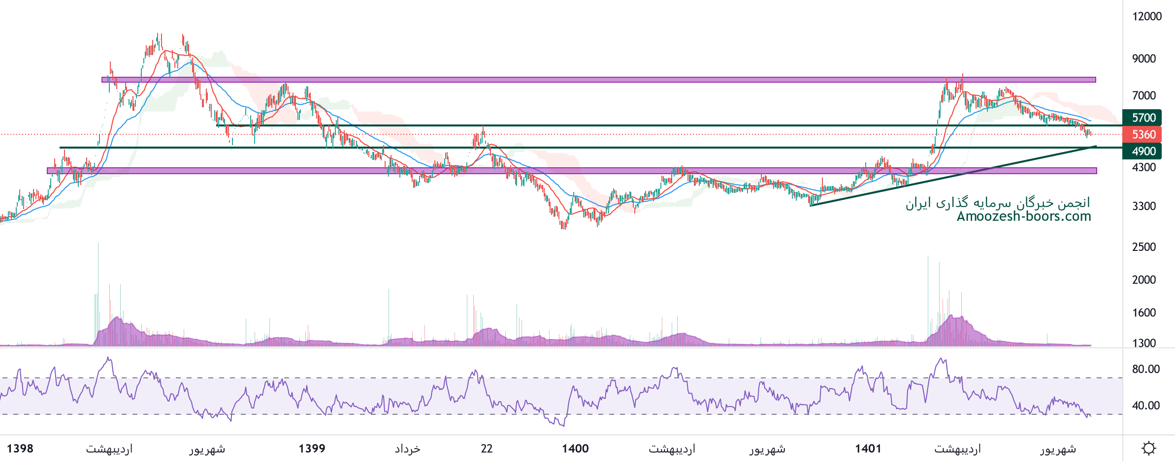 نماد رانفور در روند نزولی قرار دارد و سطح حمایتی 4900 ریال را پیش رو دارد، در صورت تثبیت در این ناحیه، سهم تا محدوده 7500 ریال حرکت خواهد کرد، همچنین در صورت از دست رفتن محدوده حمایتی، اصلاح سهم رانفور تا محدوده 4200 ریال ادامه خواهد داشت.
