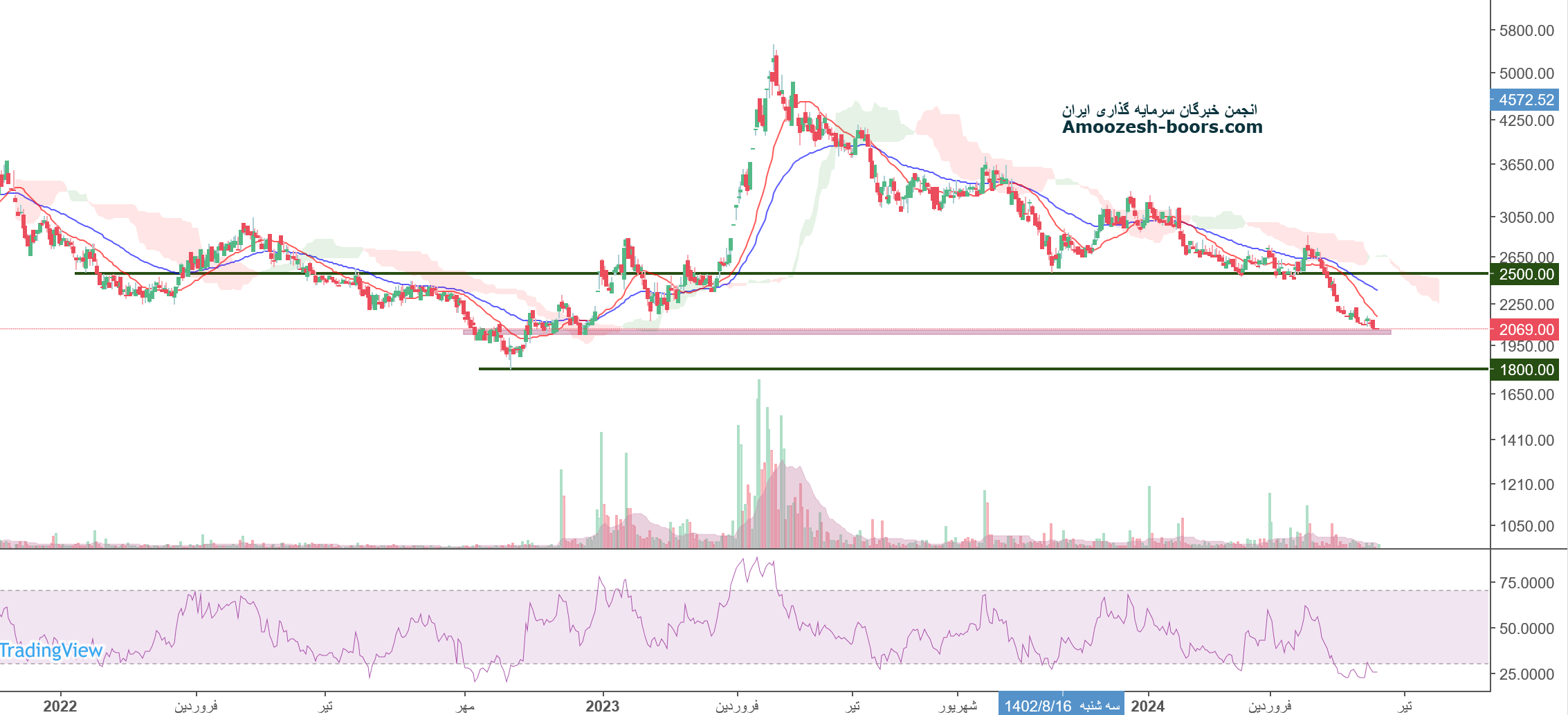 حمایت نماد رتاپ از ناحیه پر تراکم 2600 ریال تشکیل شده و در صورت شکست این سطح تا حمایت بعدی سهم رتاپ ( 2300 ریال ) 10% فاصله وجود دارد.