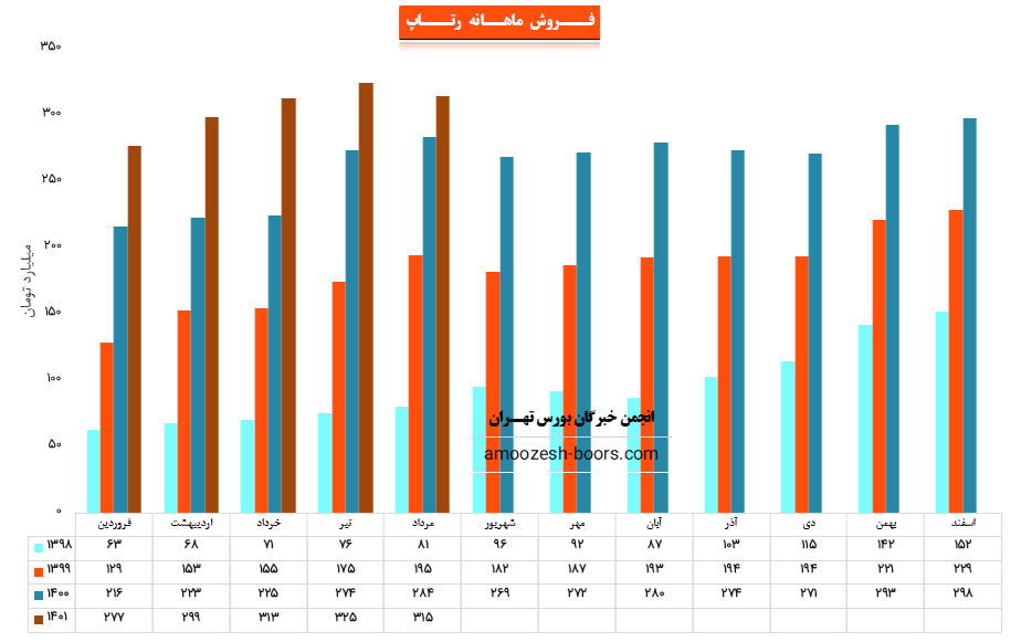 سهم رتاپ (شرکت تجارت الکترونيک پارسيان) در مرداد ماه ۱۴۰1 حدود مبلغ 315 میلیارد تومان درآمد داشته که این میزان در مقایسه با ماه گذشته 3% کاهش و همچنین در مقایسه با مدت مشابه سال گذشته 11% رشد درآمد پیدا کرده است.