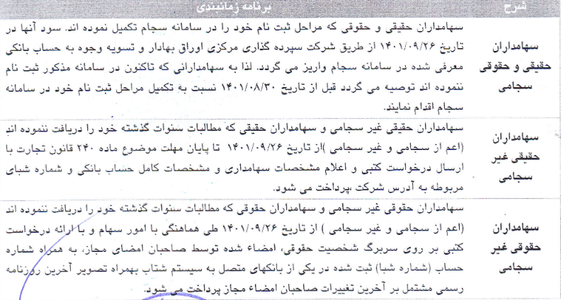 بدینوسیله زمانبندی پیشنهادی هیات مدیره در خصوص پرداخت سود به سهامداران نماد رکیش در تاریخ مجمع عمومی عادی سالیانه منتهی به ۰/۰۹/۳۰ -۱۴ بر اساس جدول زمانبدی ذیل تقدیم می گرد: