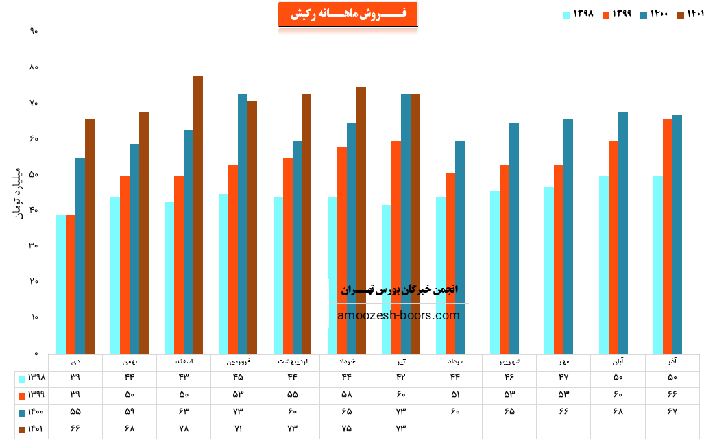 نماد رکیش (شرکت کارت اعتباری ایران کیش) در شهریور ماه معادل 72.4 میلیارد تومان از محصولات خود را به فروش رسانده است که نسبت به دوره 1 ماهه مشابه سال قبل 12% افزایش داشته است.