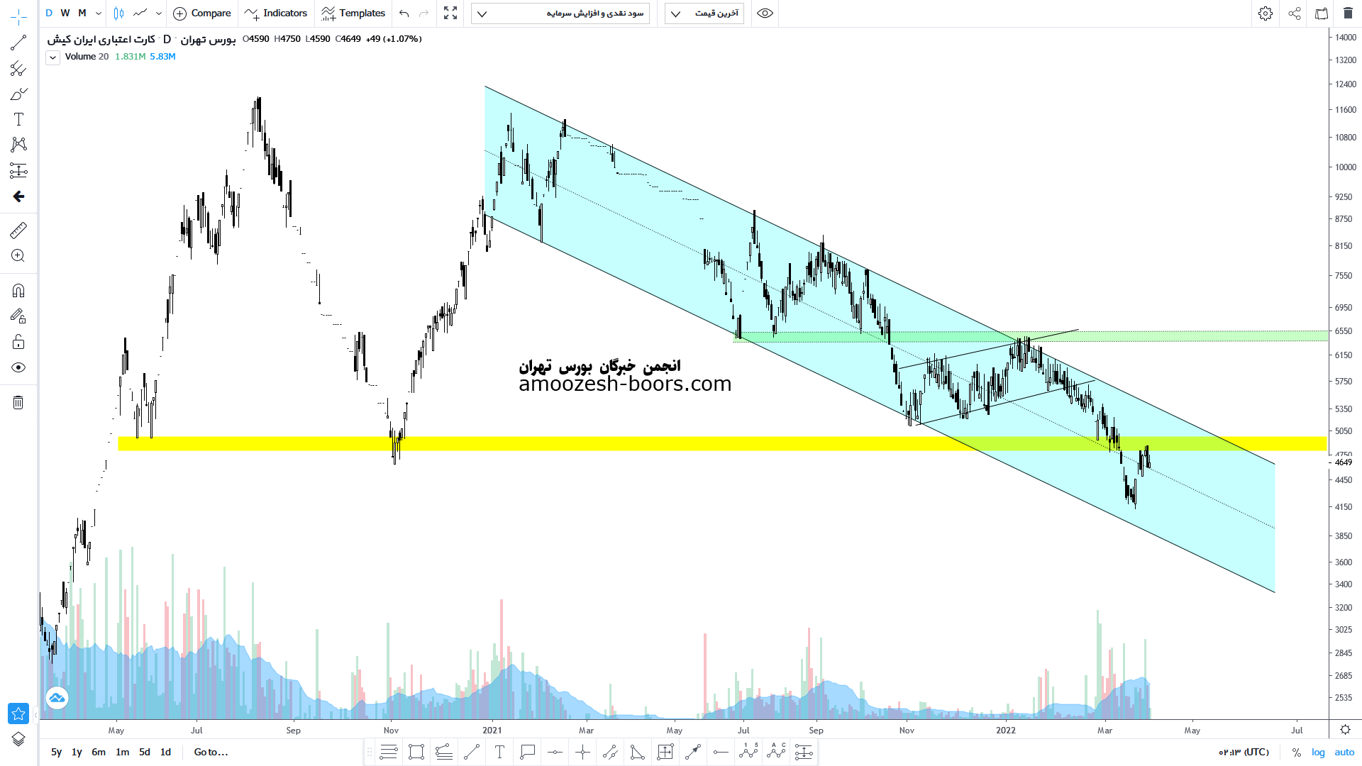 قیمت پس از از شکست کف حمایتی محدوده ۴۹۰ تومان نزولی را تا محدوده کف کانال نزولی درازمدت خود تجربه کرده اکنون مقاومت محدوده حمایت از دست رفته محدوده ۴۹۰ تومان را پیش روی خود دارد دارد که در صورت شکست آن میتواند با حمله به سقف کانال نزولی خود در صورت شکست آن اخطار های اولیه تغییر روند را نشان دهد. اما در صورت عدم توانایی قیمت در شکست این محدوده پرتراکم مقاومتی یعنی محدوده ۴۹۰ الی ۵۰۰ تومان مجدداً کف کانال نزولی درازمدت تست خواهد شد.