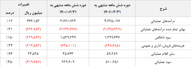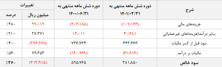 نماد رکیش (شرکت کارت اعتباری ایران کیش) در دوره 6 ماهه منتهی به 1401/03/31 به ازای هر سهم 61 ریال سود محقق کرده است که نسبت به مدت مشابه سال قبل 36% افت داشته است سایر تغییرات با اهمیت به شرح زیر میباشد :