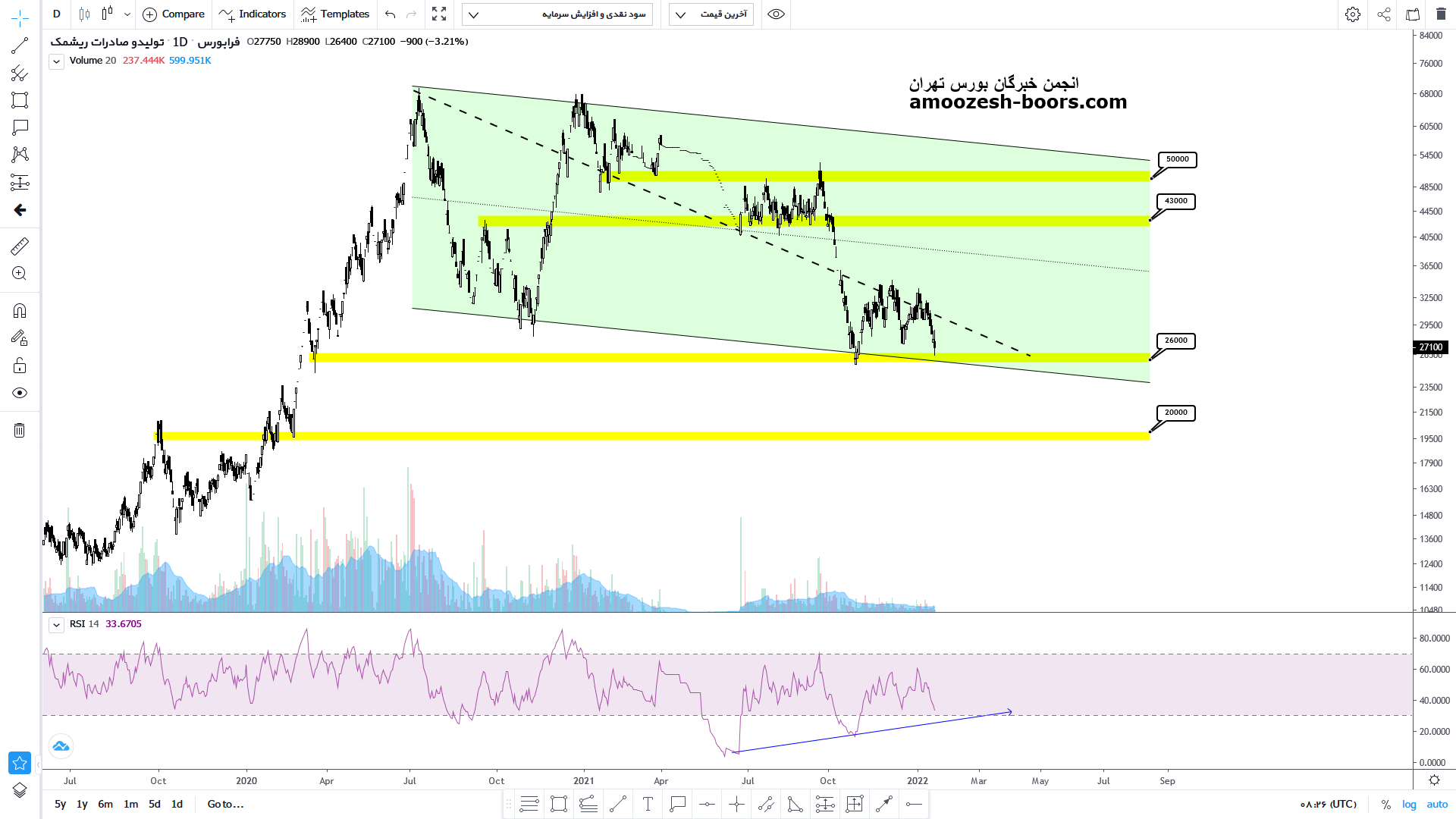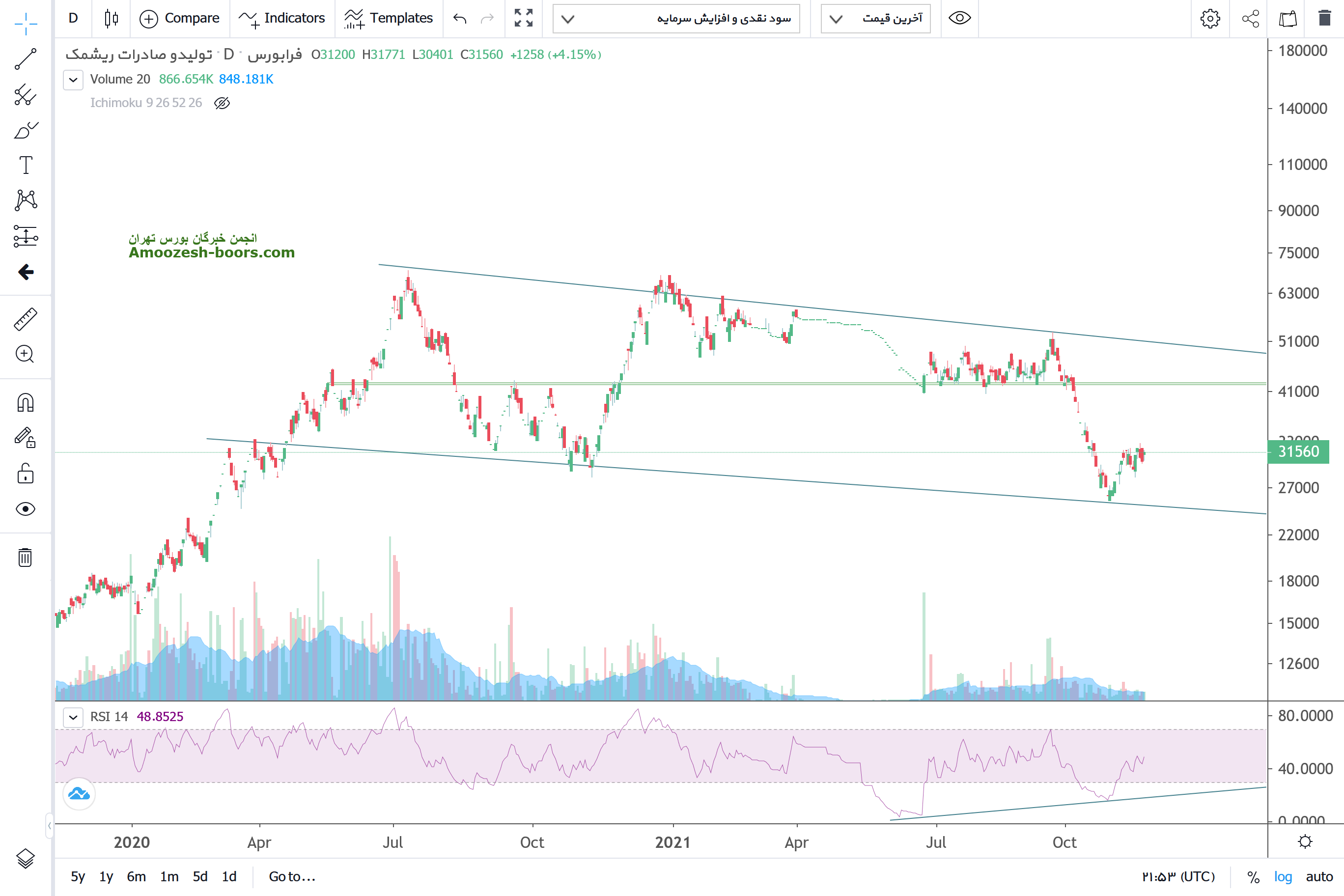 قیمت سهم ریشمک با ایجاد واگرایی مثبت کف کانال نزولی تثبیت شده و مقاومت های 30 و 35 و 43 هزار مانع حرکت شارپی تا تارگت سقف کانال خواهند شد
