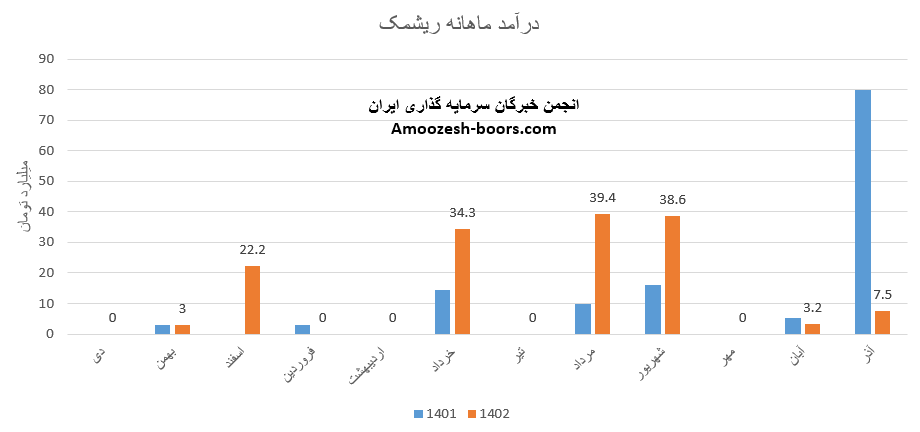 فروش آذر ماه سال 1402 سهم ریشمک 7.5 میلیارد تومان گزارش شده است، تغییرات درآمدی ریشمک به شرح زیر میباشد:
