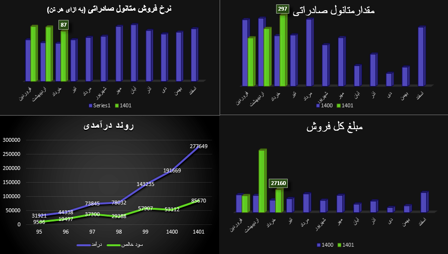 متانول بیشترین وزن از سبد فروش این شرکت را دارد که تولید این محصول 20 درصد ، مقداری فروش 3 درصد و نرخ فروش 3 درصد کاهش را نسبت به ماه گذشته تجربه نموده است .