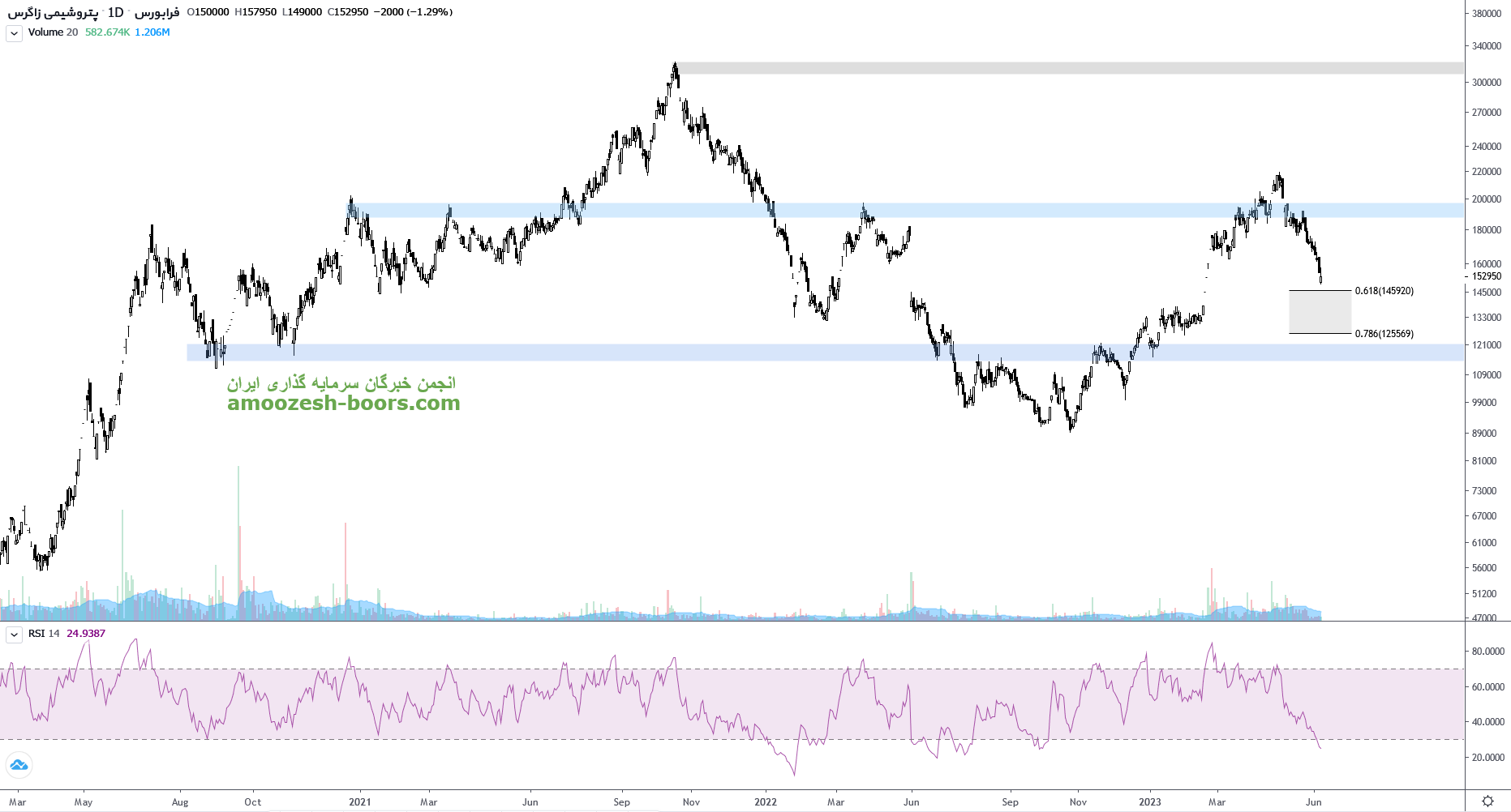 در بررسی نمودار تکنیکال زاگرس، قیمت سهم به محدوده حمایتی 120000 ریال رسیده و در حال تثبیت روی این محدوده میباشد، در صورتی که موفق شود، مقاومت های سهم زاگرس به ترتیب 170000 و 200000 ریال در نظر گفته خواهد شد، همچنین در صورت از دست رفتن محدوده حمایتی، حمایت بعدی 105000 ریال خواهد بود.