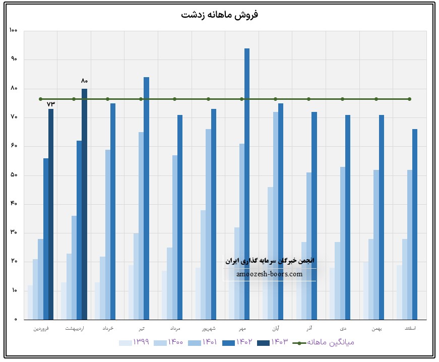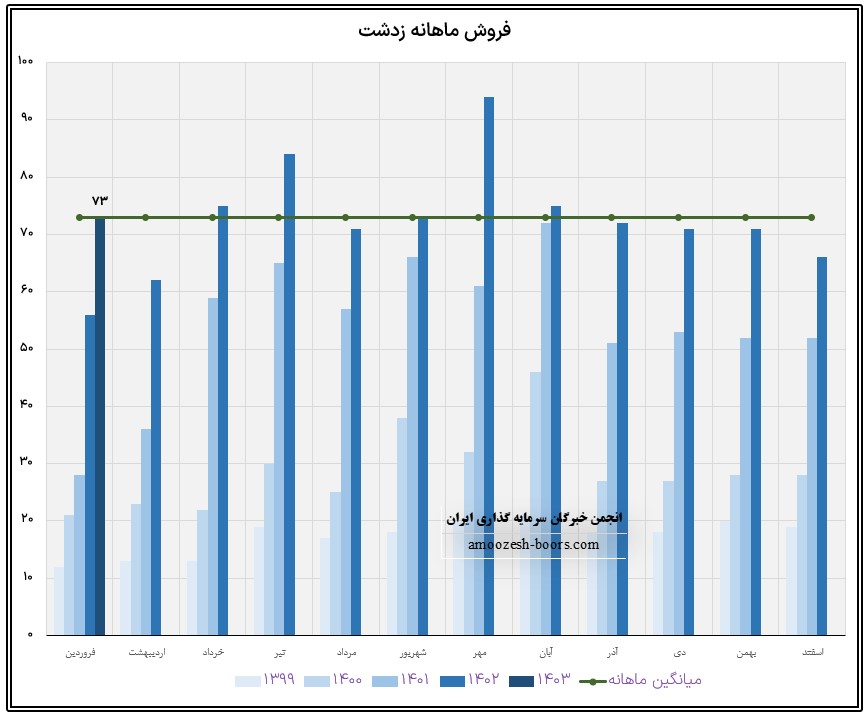 سهم زدشت در فروردین ماه حدود بیش از 4200 تن معادل 63 میلیارد تومان از محصول اصلی خود یعنی شیر گاو را به فروش رسانده که این میزان در مقایسه با حجم فروش ماه گذشته خود حدود 8% افزایش داشته است.
