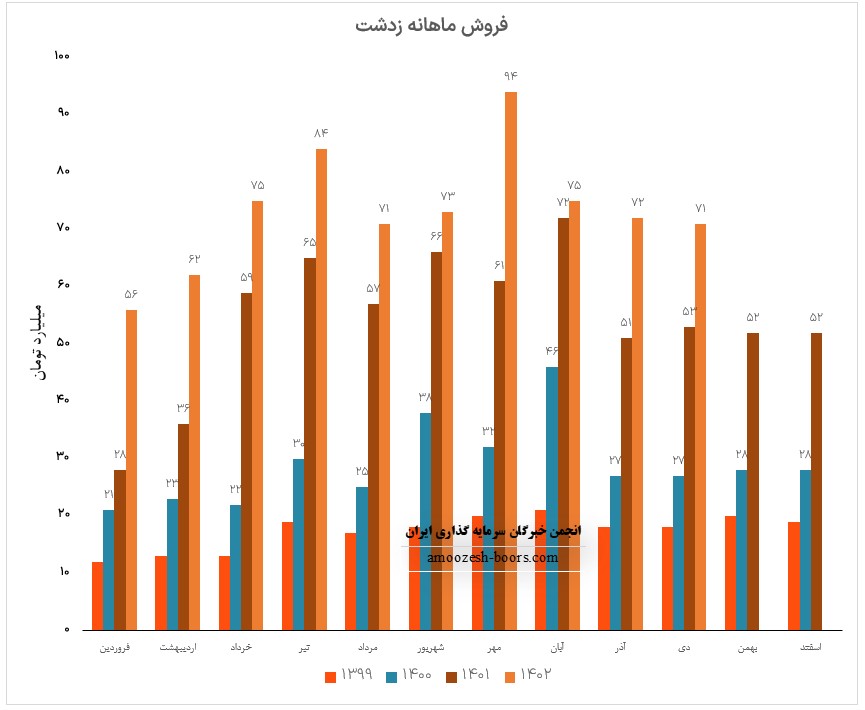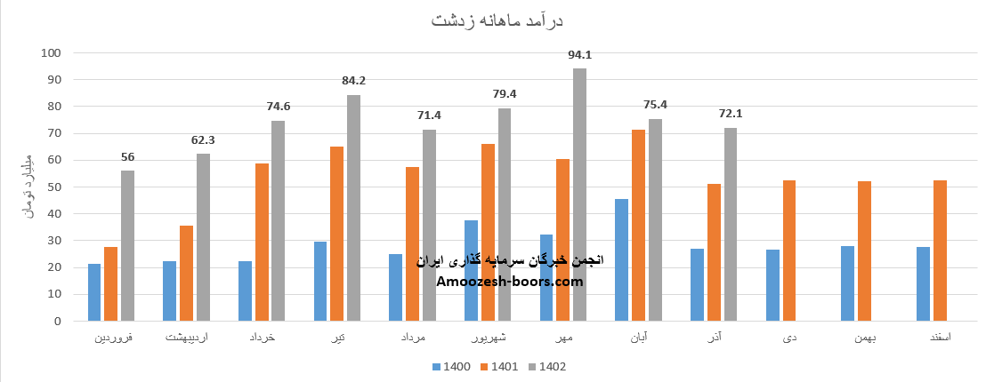 فروش آذر ماه سال 1402 سهم زدشت 72.1 میلیارد تومان گزارش شده است، تغییرات درآمدی زدشت به شرح زیر میباشد: