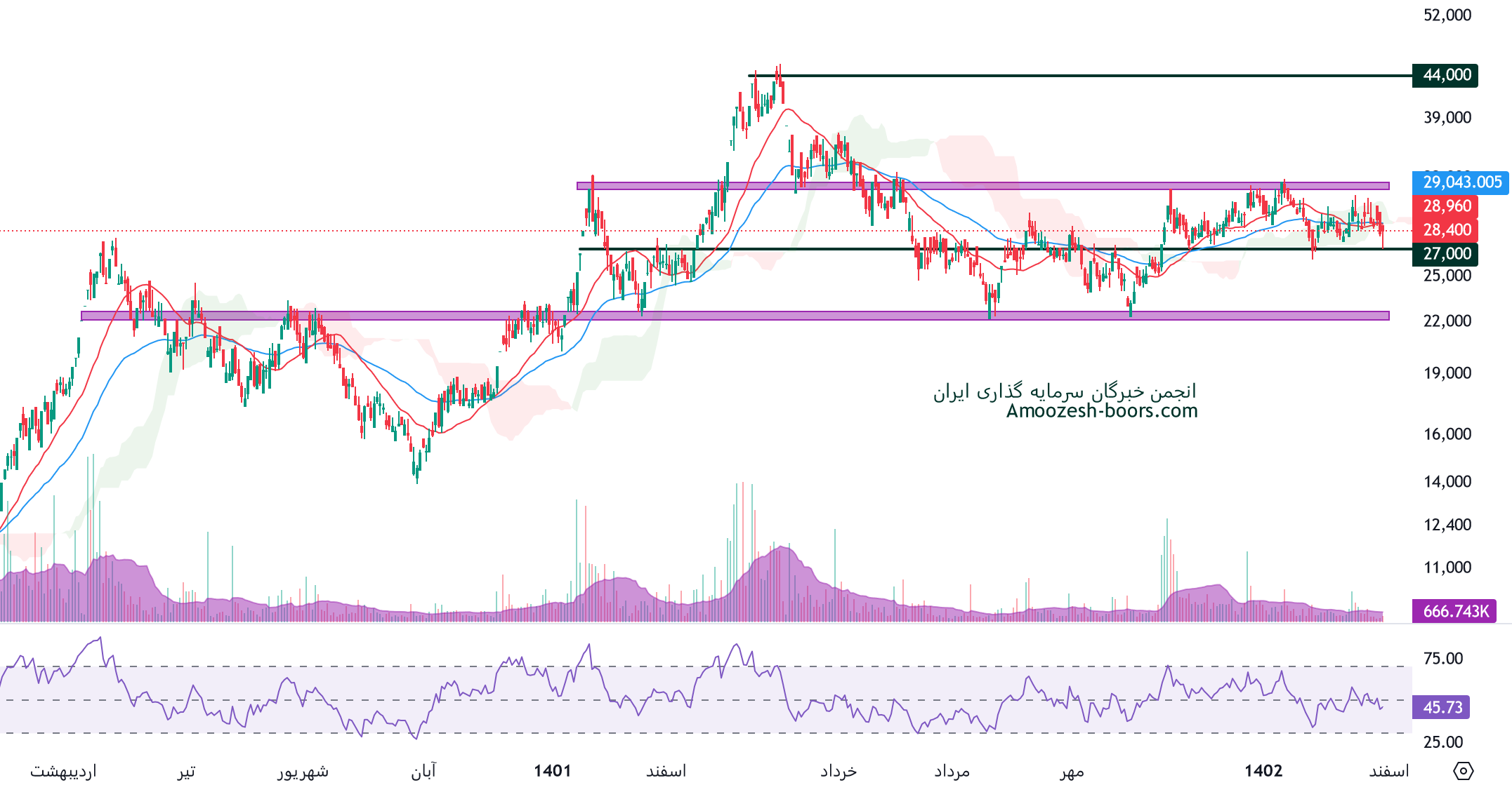 همانطور که در تحلیل تکنیکال زدشت میبینیم قیمت در محدوده حمایتی 27000 ریال و محدوده مقاومتی 32000 ریال در حال نوسان میباشد.