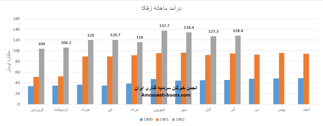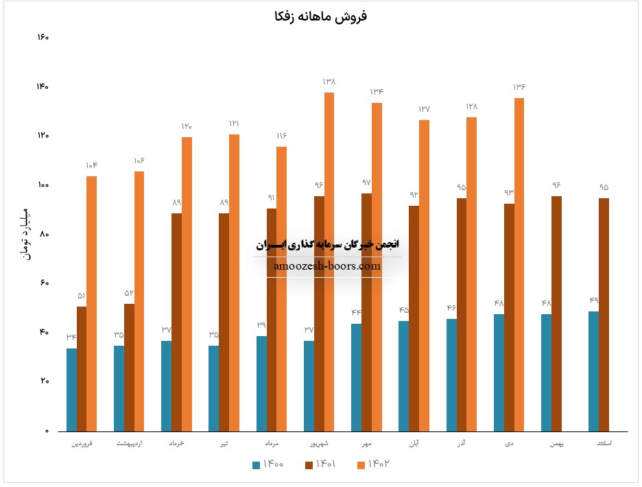 فروش آذر ماه سال 1402 سهم زفکا 128.4 میلیارد تومان گزارش شده است، تغییرات درآمدی زفکا به شرح زیر میباشد: