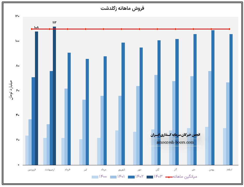 نماد زگلدشت (شرکت کشت و دام گلدشت نمونه اصفهان) در اردیبهشت ماه 1403 حدود مبلغ 112 میلیارد تومان درآمد داشته که این میزان در مقایسه با ماه گذشته 4% و همچنین در مقایسه با مدت مشابه سال گذشته 47% رشد پیدا کرده است.
