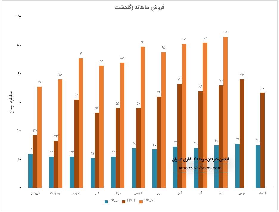 شرکت کشت و دام گلدشت نمونه اصفهان ( زگلدشت ) در بهمن ماه 1402 فروش 108.9 میلیارد تومانی را به دست آورده که افزایش 2 درصدی در مقایسه با ماه گذشته و همچنین رشد 19 درصدی نسبت به متوسط ماهانه داشته است،