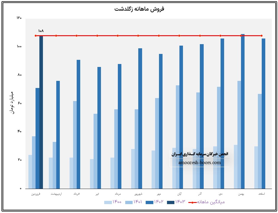 نماد زگلدشت (شرکت کشت و دام گلدشت نمونه اصفهان) در فروردین ماه 1403 حدود مبلغ 108 میلیارد تومان درآمد داشته که این میزان در مقایسه با ماه گذشته 2% و همچنین در مقایسه با مدت مشابه سال گذشته 52% رشد پیدا کرده است.
