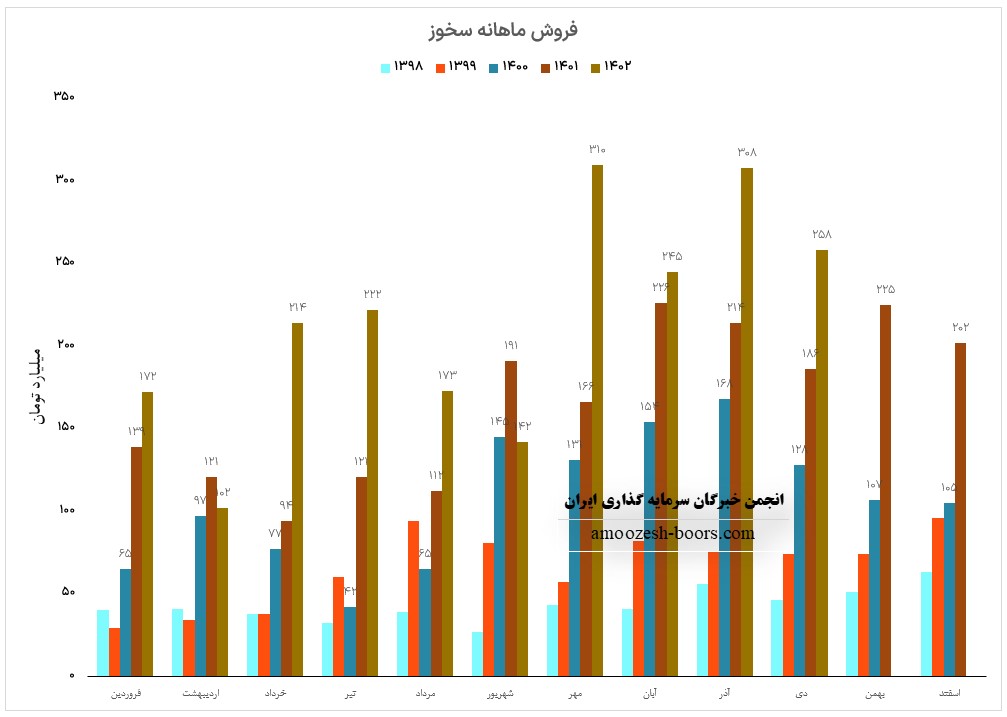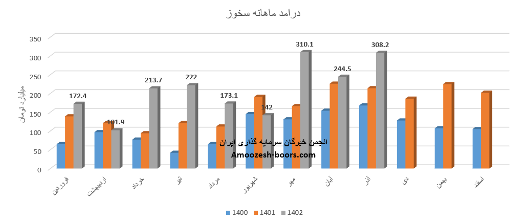 فروش آذر ماه سال 1402 سهم سخوز 308.2 میلیارد تومان گزارش شده است که از این درآمد 44% از طریق فروش داخلی و مابقی از طریق فروش صادراتی تامین گردیده است، تغییرات درآمدی سخوز به شرح زیر میباشد: