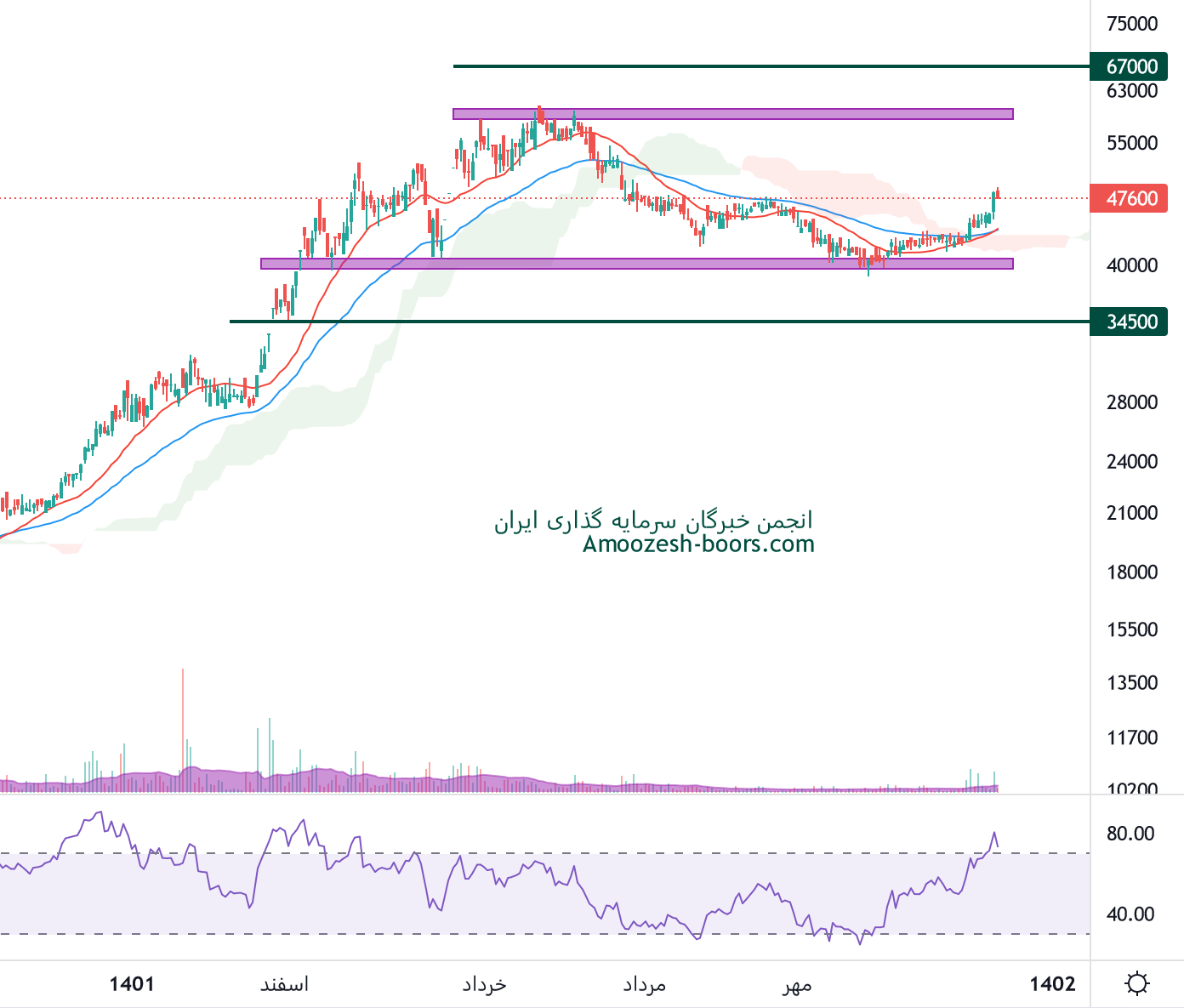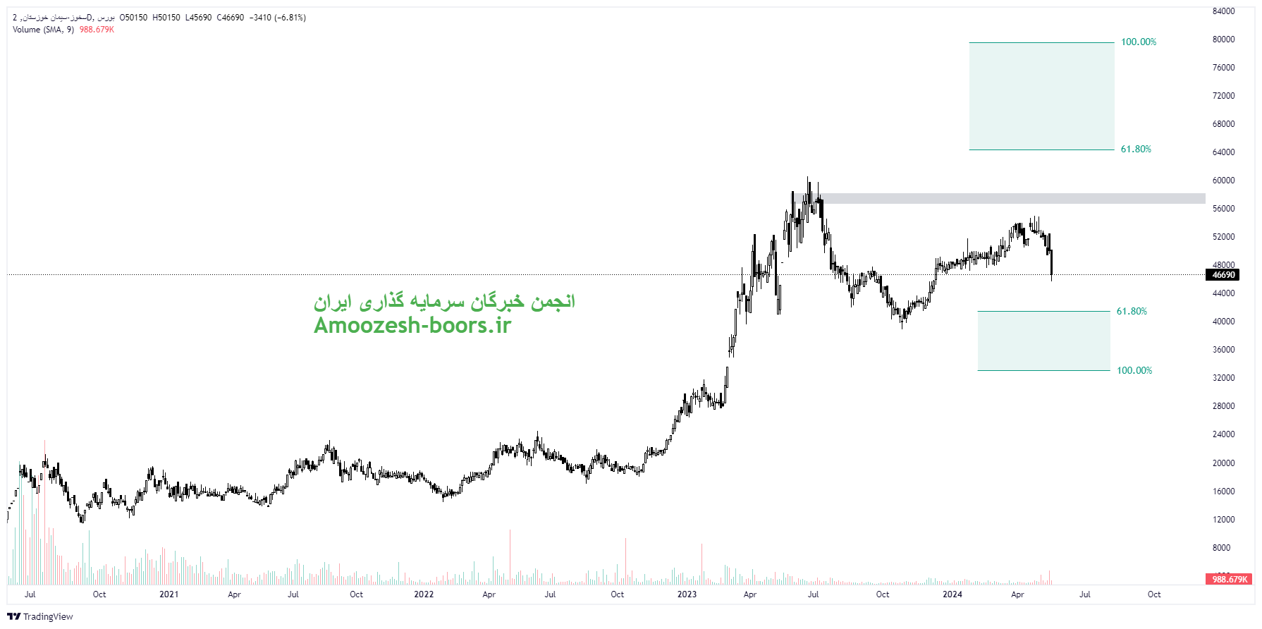 سهم سخوز در مسیر اصلاحی نواحی حمایتی 41000 ریال و 33000 ریال را پیش روی خود دارد که در صورت ایجاد تقاضا در کلیت بازار میتواند از این نواحی تغییر روندی را نشان دهد. لذا در صورت بروز چنین سناریویی مقاومتهای سهم سخوز در روند صعودی به ترتیب نواحی ۵۷۵۰۰ ریال، 65000 ریال و 80000 ریال در میان مدت در نظر گرفته خواهد شد.