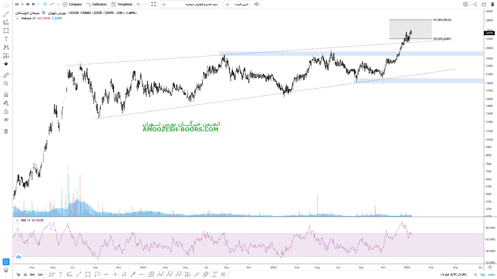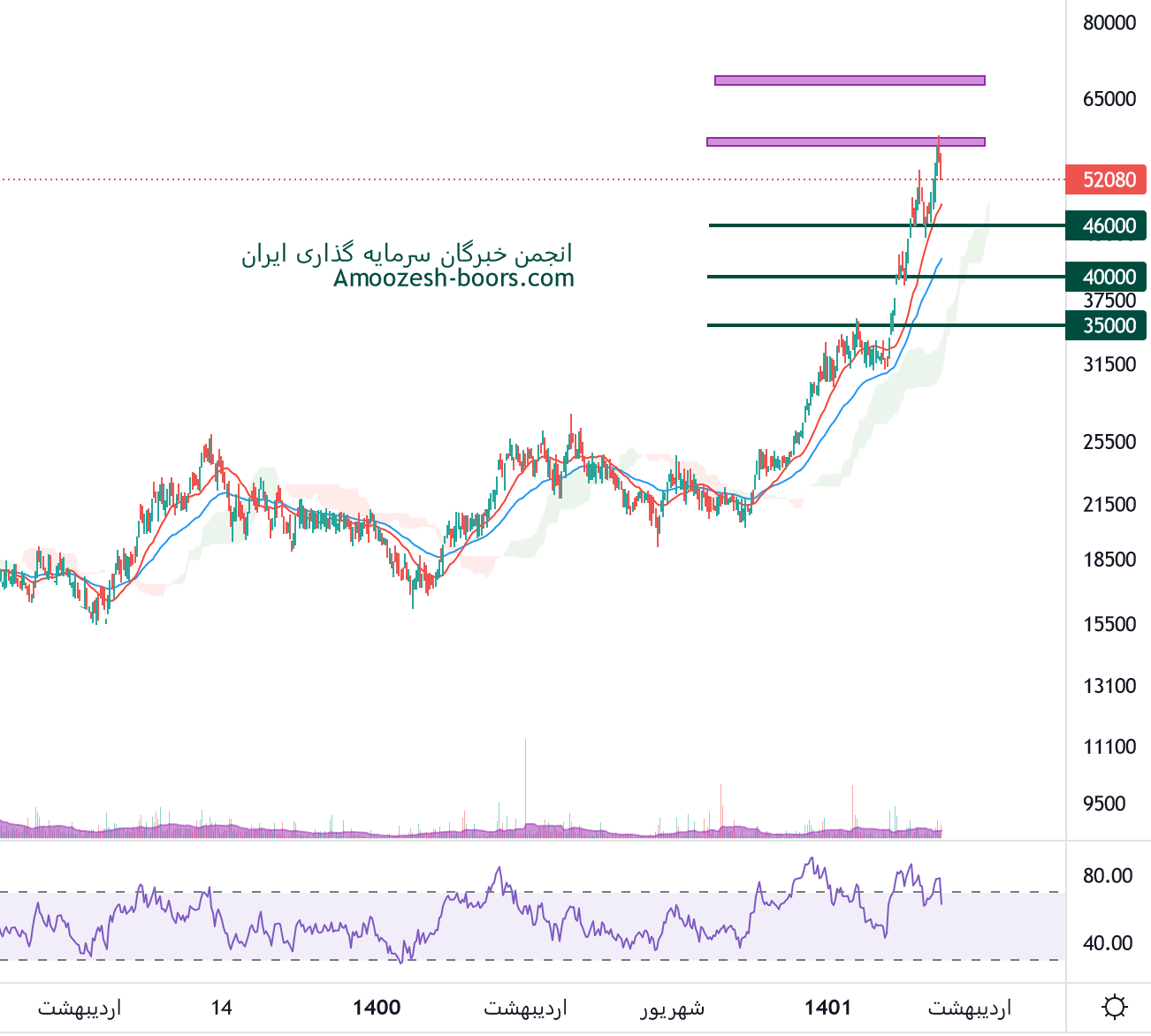 نمودار سخوز موقعیت پر ریسکی را نشان میدهد، قیمت با حرکت سریعی به تارگت خود که از تلاقی دو ناحیه مهم فیبوناچی ارزیابی میشد رسیده است، در حال حاضر قیمت سهم سخوز با توجه به رشد اخیر نیازمند استراحت میباشد، در صورتی که شرایط روانی بازار مساعد باشد، استراحت و اصلاح نماد سخوز به صورت زمانی پیش خواهد رفت، پس از تخلیه هیجان چارت سخوز مقاومت محدوده 68000 ریال فعال خواهد شد.