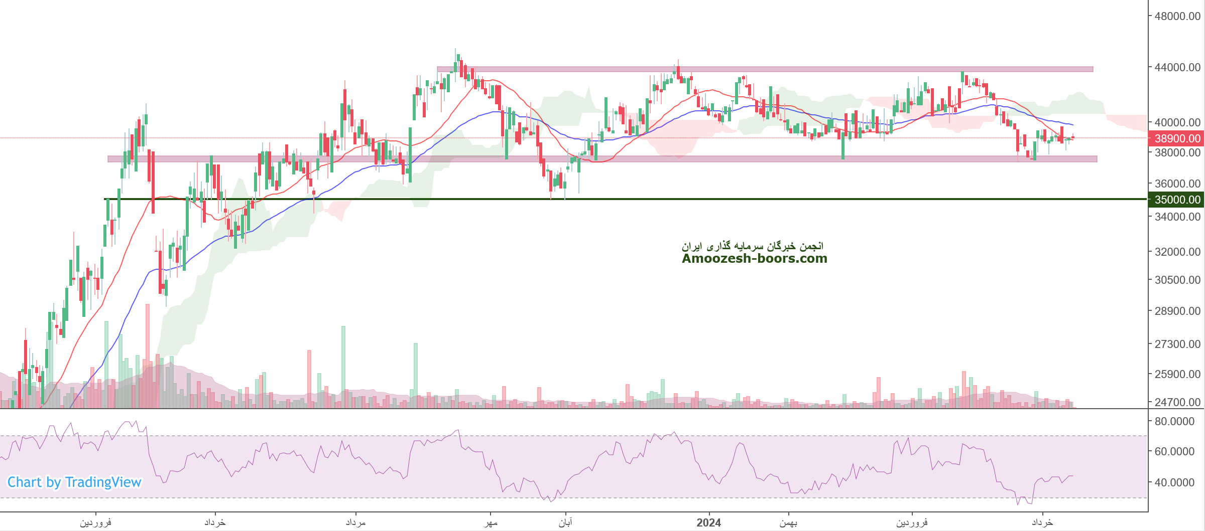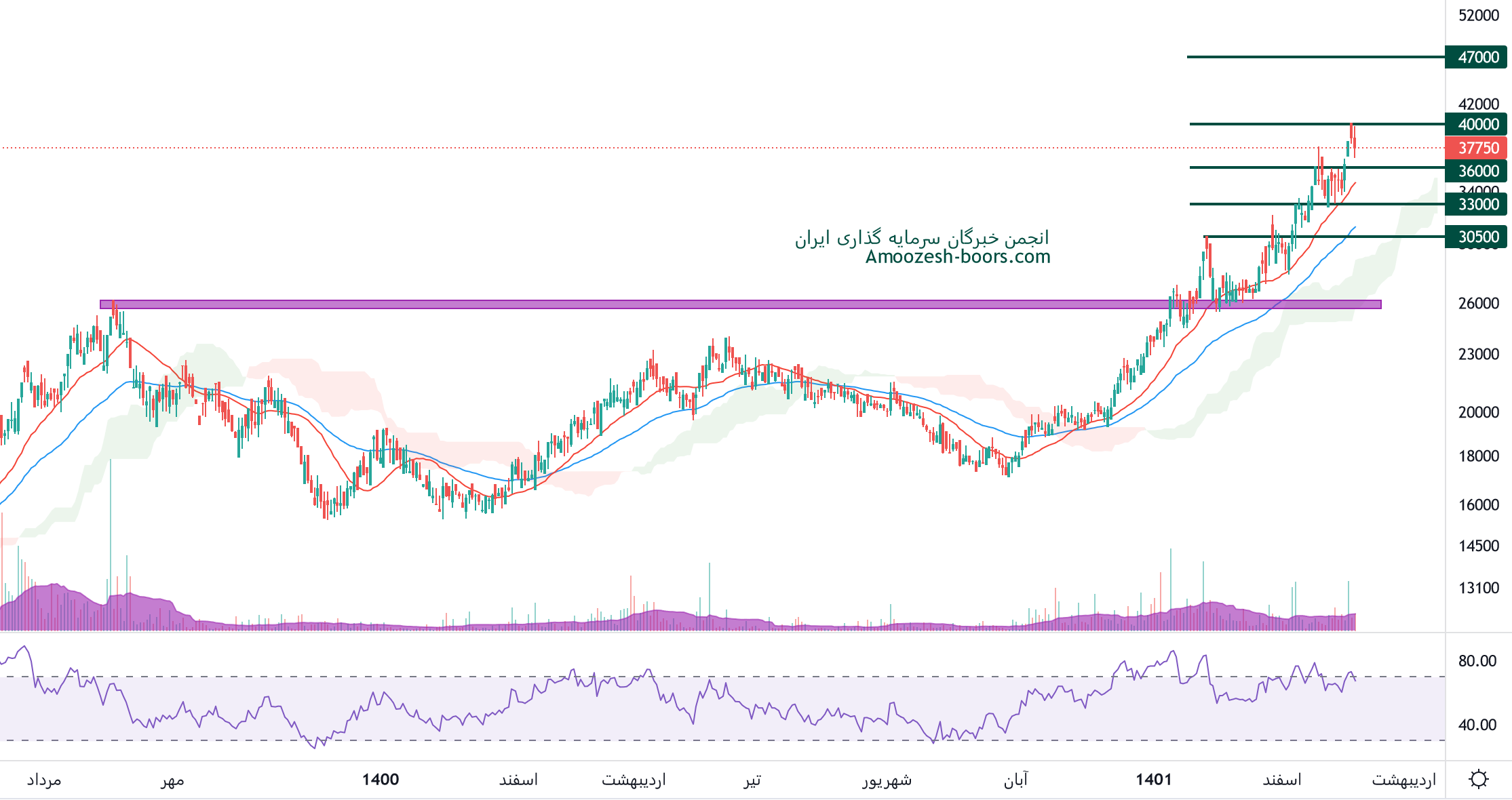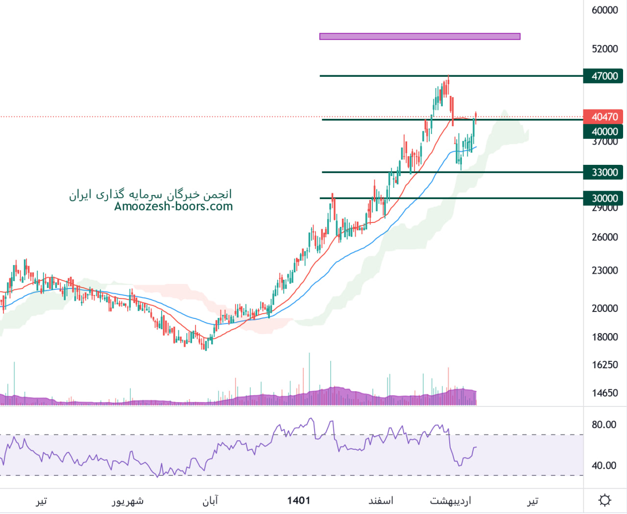 نماد سرود درگیر سطح مقاومتی 40000 ریال میباشد، در صورت عبور قیمت از این سطح، مقاومت های بعدی 47000 و 55000 ریال خواهند بود، همچنین در صورت ورود سهم سرود به فاز اصلاحی، 33000 ریال اولین حمایت سرود در نظر گرفته خواهد شد.