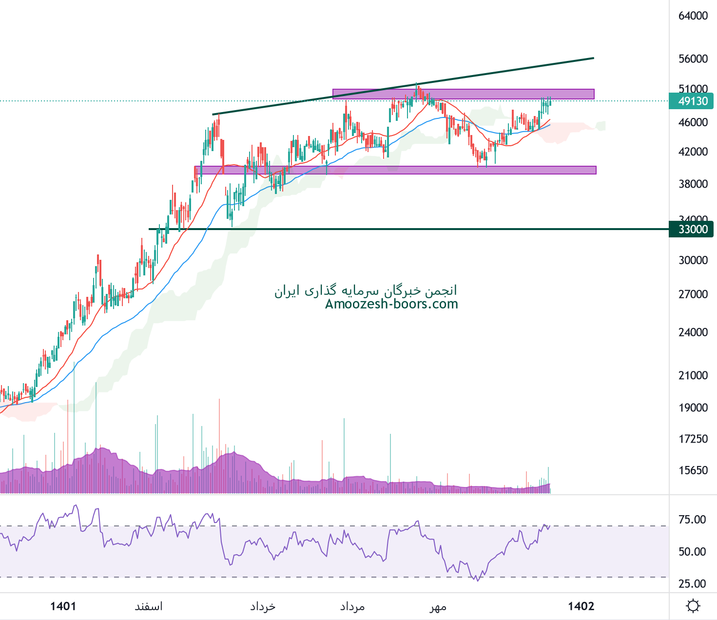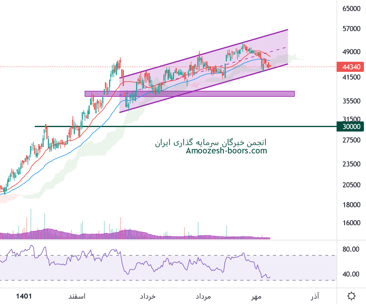 در بررسی نمودار تکنیکال سرود قیمت سهم محدوده حمایتی 44000 ریال را دارا میباشد، در صورت تثبیت و بیس سازی قیمت در این منطقه، تارگت سهم سقف کانال صعودی در محدوده 55000 ریال خواهد بود، همچنین در صورت از دست رفتن محدوده حمایتی ذکر شده، حمایت بعدی سرود محدوده 37000 ریال ارزیابی خواهد شد.