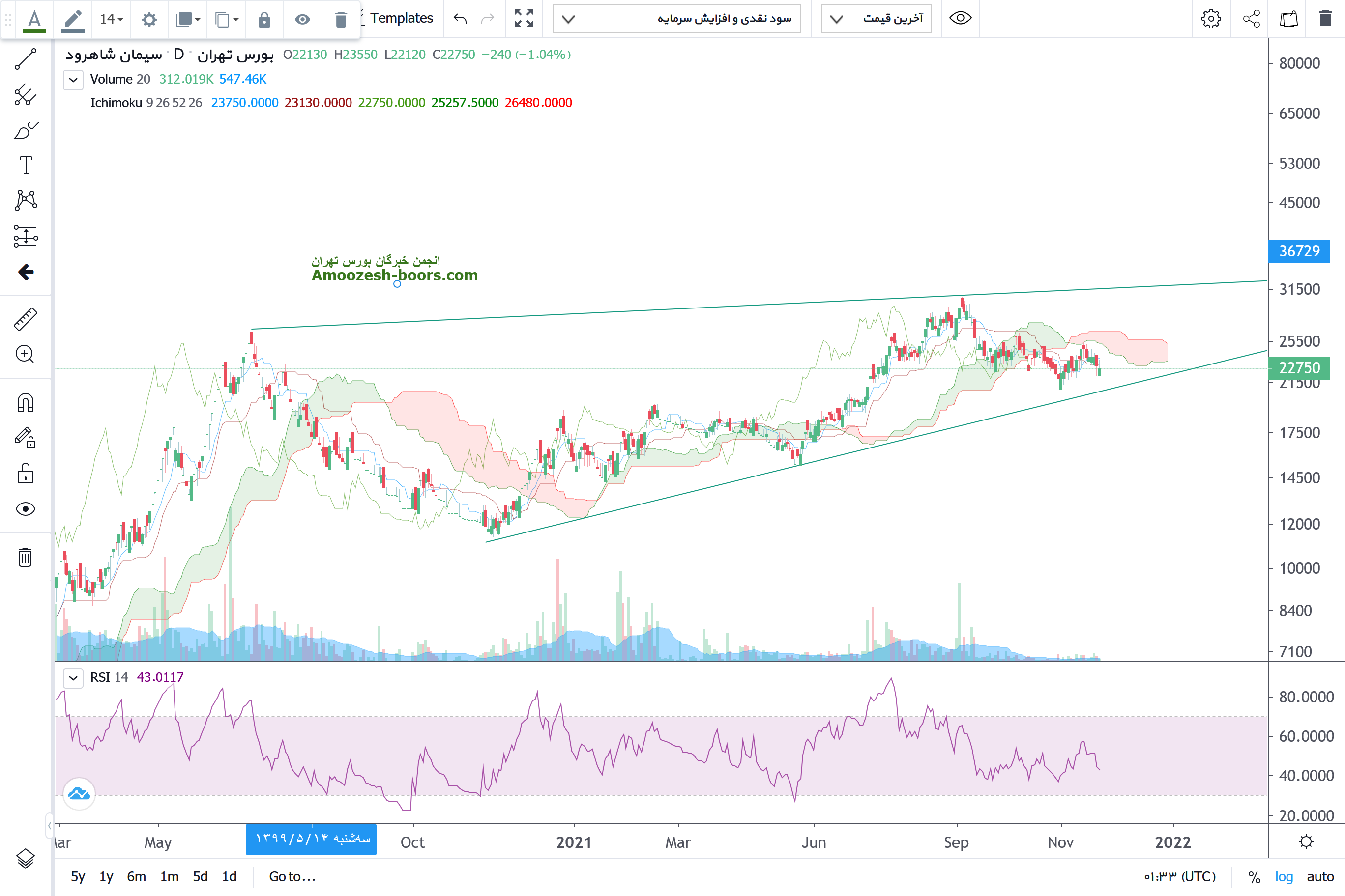 سهامداران محترم سیمان شاهرود در نظر داشته باشند قیمت درگیر مقاومت داینامیک سقف کانال شده و اوسلاتور اشباع خرید نیز واگرایی مشهودی را ایجاد نموده و از محدوده اشباع خرید گارد نزولی بخود گرفته است.