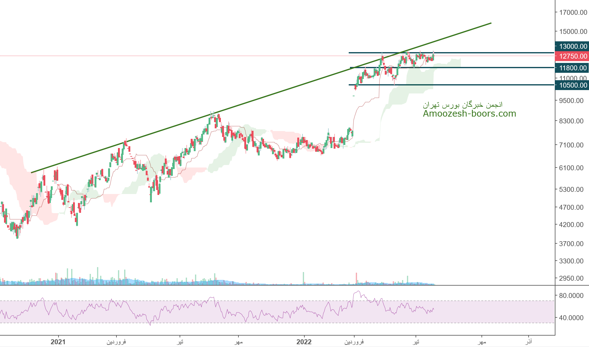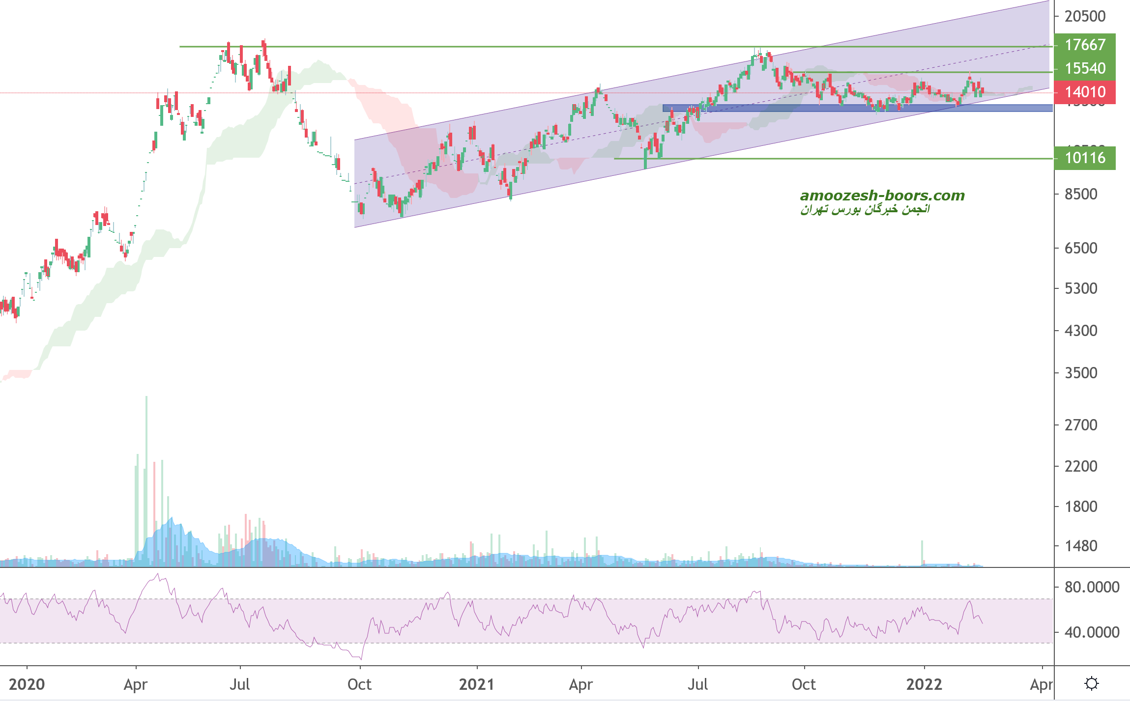 قیمت در حال حاضر روی کف کانال صعودی در محدوده حمایت استاتیک خود قرار دارد در صورت از دست رفتن این ناحیه نزول قیمت تا حمایت استاتیک و روانی عدد رند 10000 ریال محتمل خواهد بود که در این صورت حد ضرر سهم فعال خواهد شد و در صورت تثبیت و فشار خرید تارگت اول و دوم سهم به ترتیب 15500 ریال و 17500 ریال خواهد بود.