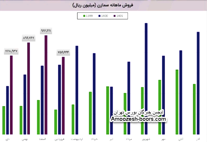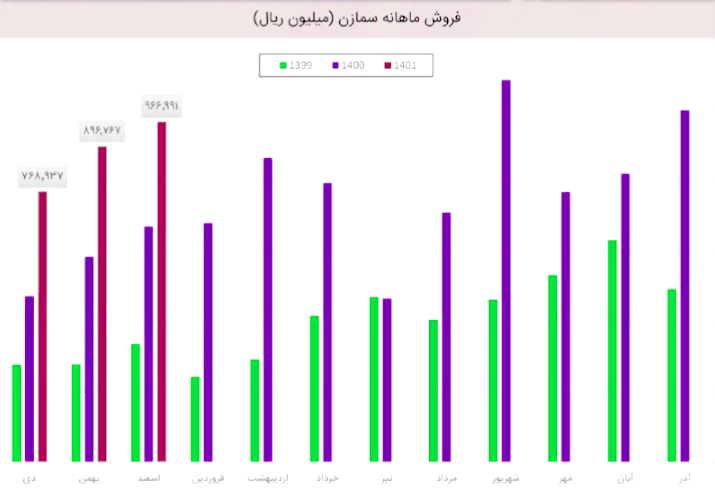 سمازن در اردیبهشت فروش فوقالعاده 1.048 میلیارد ریالی را ثبت کرده است. این مقدار در ماه گذشته و اردیبهشت سال قبل 756 و 864 میلیارد ریال گزارش شده بود که (90%) درصد آن مربوط به فروش داخلی و (10%) درصد آن مربوط به کل صادرات شرکت است.