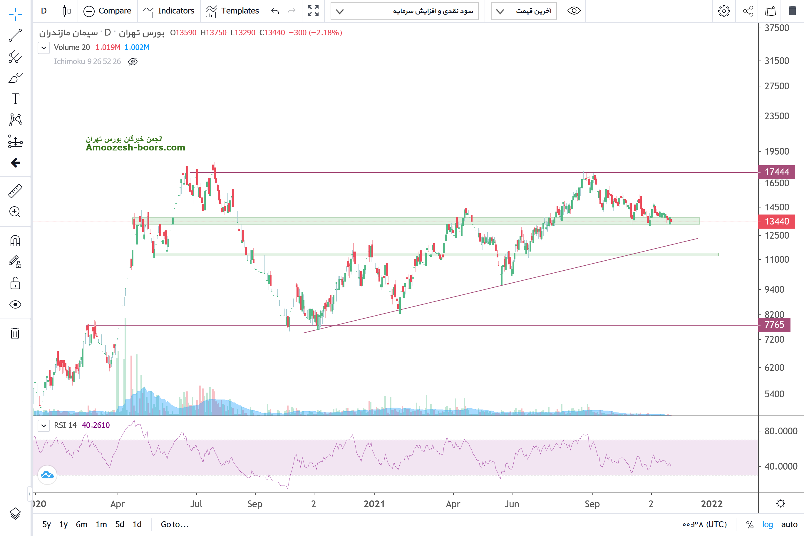 سمازن در مرحله تریدینگ رنج و در حال حاضر در منطقه حمایتی قرار گرفته در صورت تثبیت مقاومت 15500 و 17500 بر سر راه سهم قرار دارد و در صورتفشار فروش هم حمایت های 13500 و 11500 میتواند از ریزش سهم جلوگیری نماید . با توجه به شرایط مناسب فاندامنتال این شرکت و مومنتوم ضعیف کاهش قیمت ، احتمال تثبیت قیمت وجود دارد. .