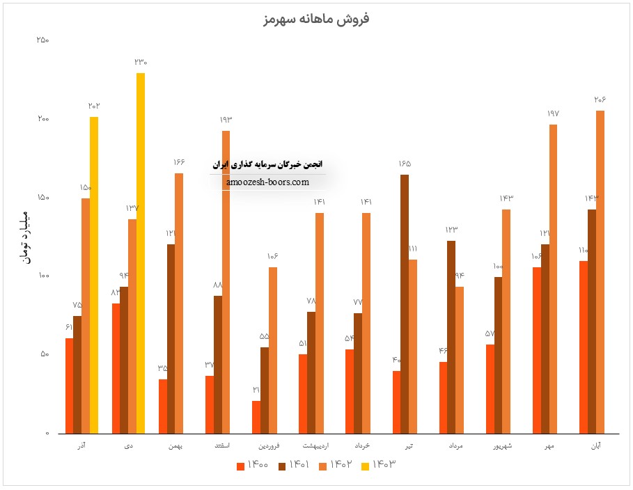 فروش سهرمز در این ماه افزایش 0.3 % در مقایسه با ماه گذشته داشته است . همچنین در مقایسه به مدت مشابه 22% و نسبت به متوسط ماهانه 8% افزایش داشته است .