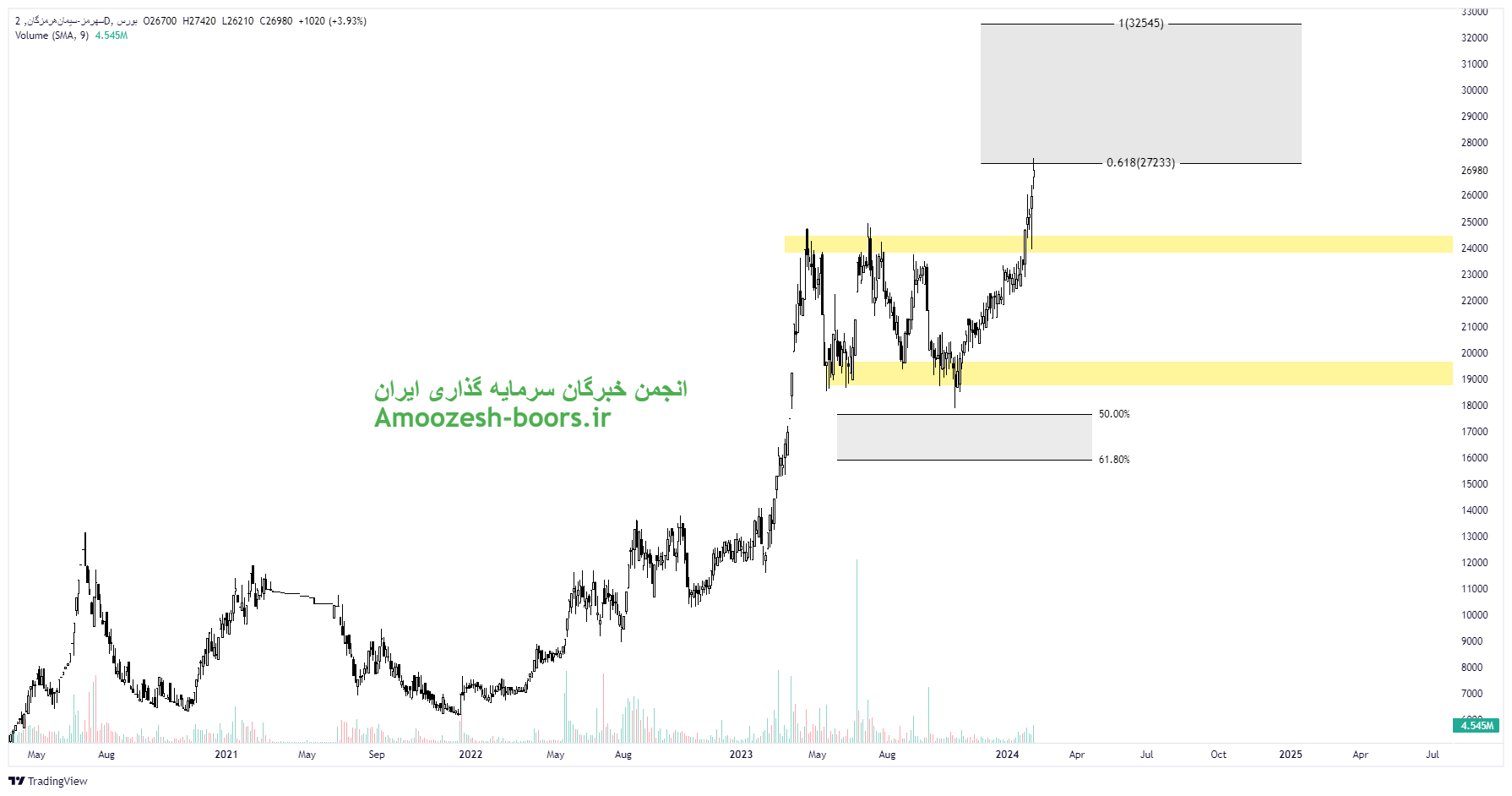 سهم هرمز به مقاومت ناحیه ۲۷۰۰ تومان نزدیک شده است لذا در صورت ایجاد فشار عرضه در سهم و بروز واکنش منفی به این ناحیه مقاومتی، مهمترین حمایتهای سهم هرمز به ترتیب نواحی 2400 و 1900 تومان در نظر گرفته خواهد شد. اما در صورت حفظ تقاضای به وجود آمده در سهم مقاومت بعدی ناحیه ۳۳۰۰ تومان در نظر گرفته خواهد شد.