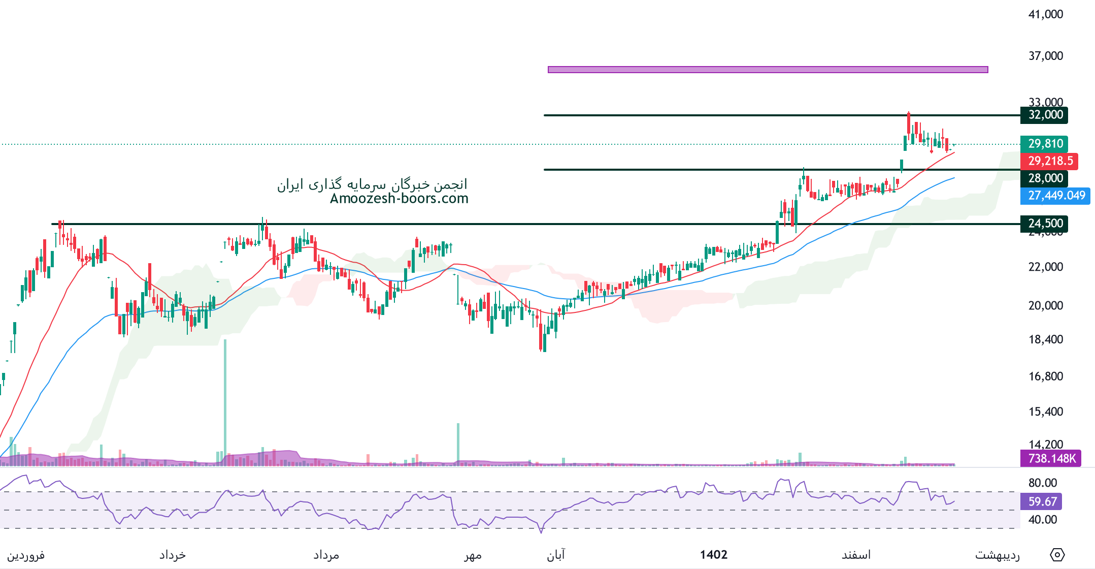 همانطور که در تحلیل تکنیکال سهرمز میبینیم قیمت در محدوده حمایتی 28000 ریال و محدوده مقاومتی 32000 ریال در حال نوسان میباشد.