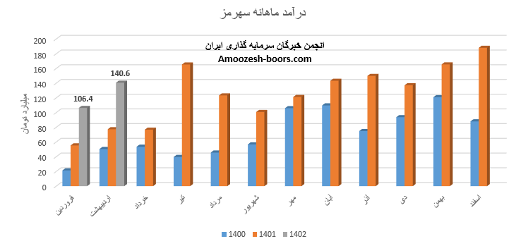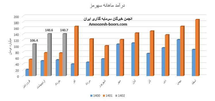 نماد سهرمز (شرکت سیمان هرمزگان) در تیر ماه سال 1402 حدود مبلغ 111 میلیارد تومان درآمد داشته که این میزان در مقایسه با ماه گذشته 21% و همچنین در مقایسه با مدت مشابه سال گذشته 33% افت پیدا کرده است. نماد سهرمز در تیر ماه حدود بیش از 133 هزار تن از محصولات خود را به فروش رسانده که این میزان در مقایسه با حجم فروش ماه گذشته خود حدود 17% کاهش پیدا کرده است.