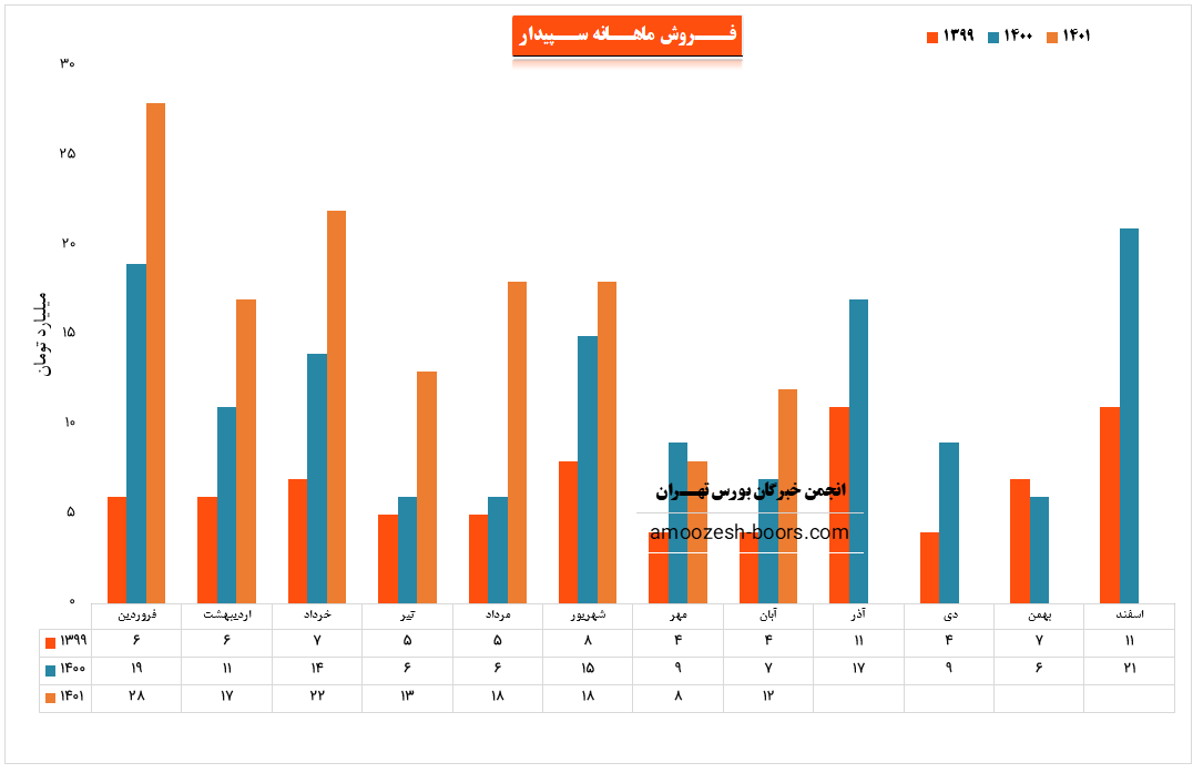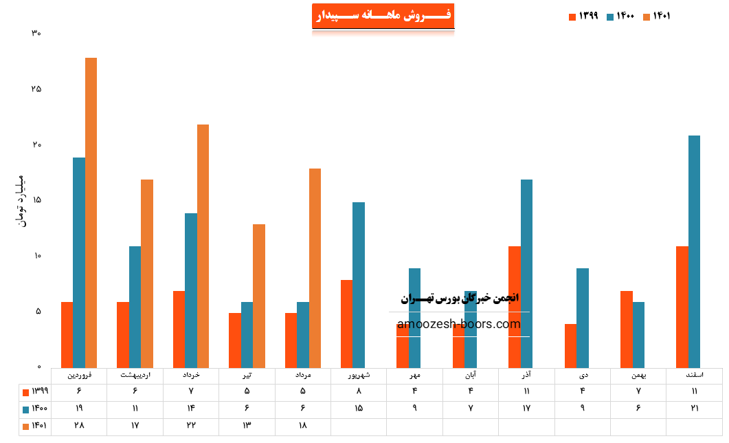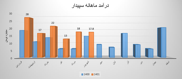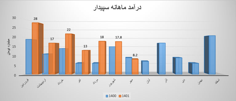 نماد سپیدار (شرکت سپیدار سیستم آسیا) در مرداد ماه سال 1401 حدود مبلغ 18 میلیارد تومان درآمد داشته که این میزان در مقایسه با ماه گذشته 38% و همچنین در مقایسه با مدت مشابه سال گذشته 200% رشد درآمد پیدا کرده است