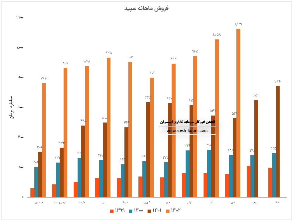 فروش سپید در این ماه افزایش 5% در مقایسه با ماه گذشته داشته است، همچنین در مقایسه به مدت مشابه 69% افزایش و نسبت به متوسط ماهانه 34% افزایش داشته است.